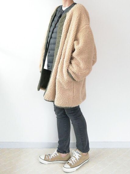 ボリュームあるボアアウターのインに。着ぶくれして見えがちなボアアウターも、コンパクトなインナーベストならすっきり見えますよ。袖がないベストは、腕まわりもモコモコしないので動きやすさもバッチリです。