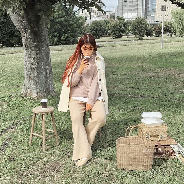ホワイト系のワントーンコーデで、秋空に映える優しい印象に。