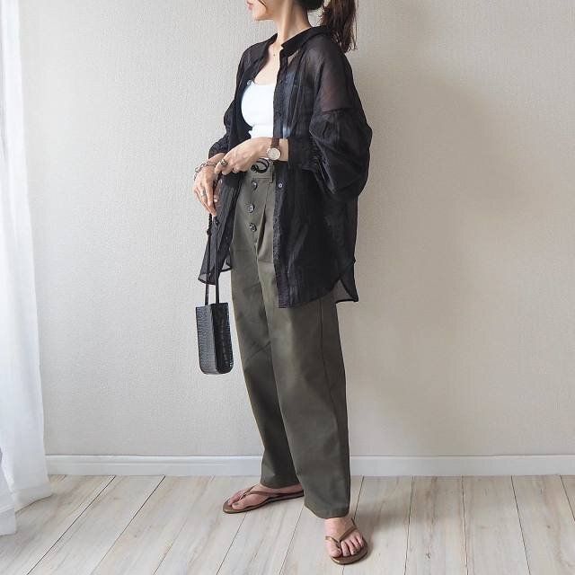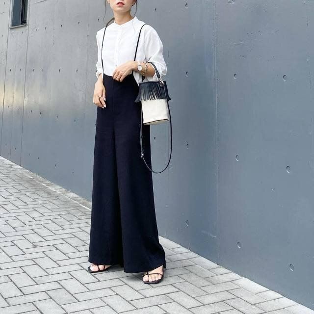 モード感たっぷりの漆黒パンツは白シャツでバランスよく