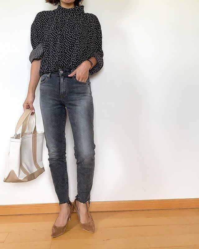 クラシカルなブラウスも炭黒デニムで大人の脱力感をだすのが◎