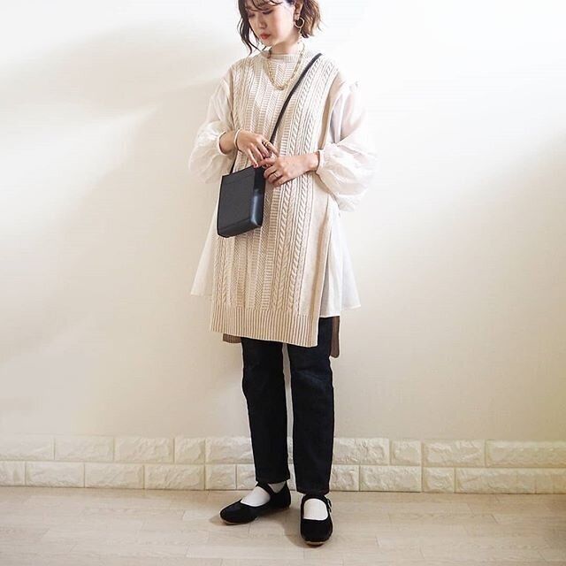 トレンドのニットベストは、ロング丈なら大人女子にもぴったり!