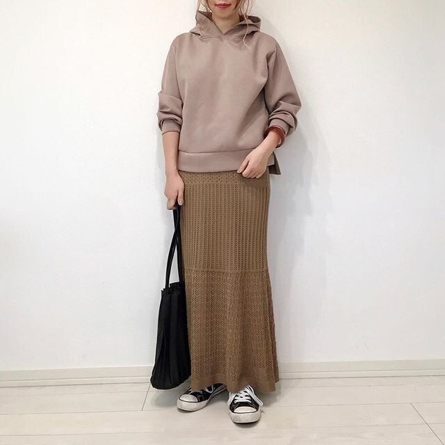 透かし編みニットスカートを、パーカーでカジュアルダウン。