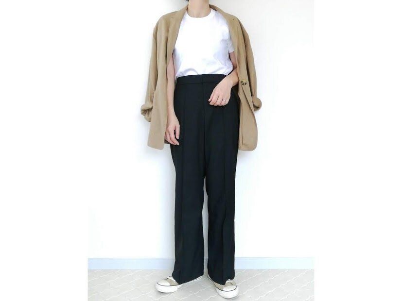 Tシャツ×ワイドパンツのシンプルコーデにジャケットをプラス。