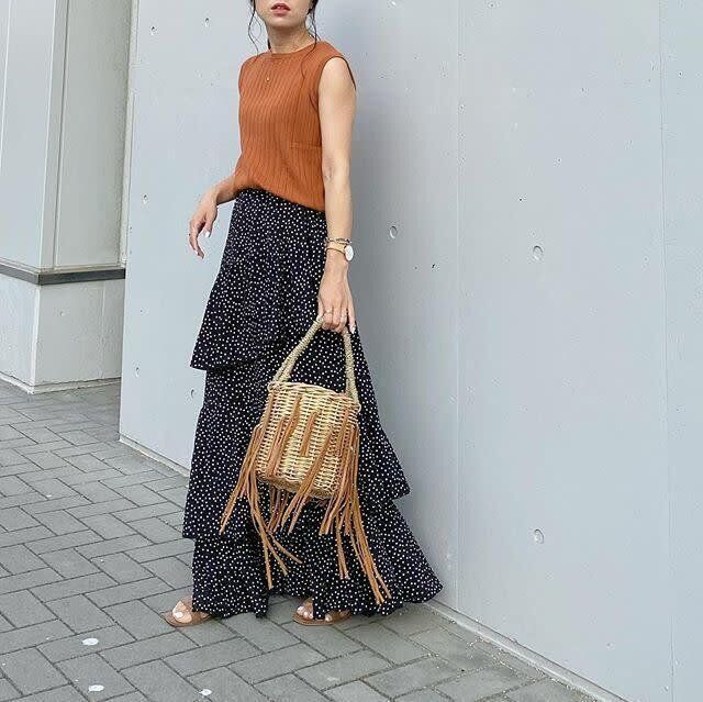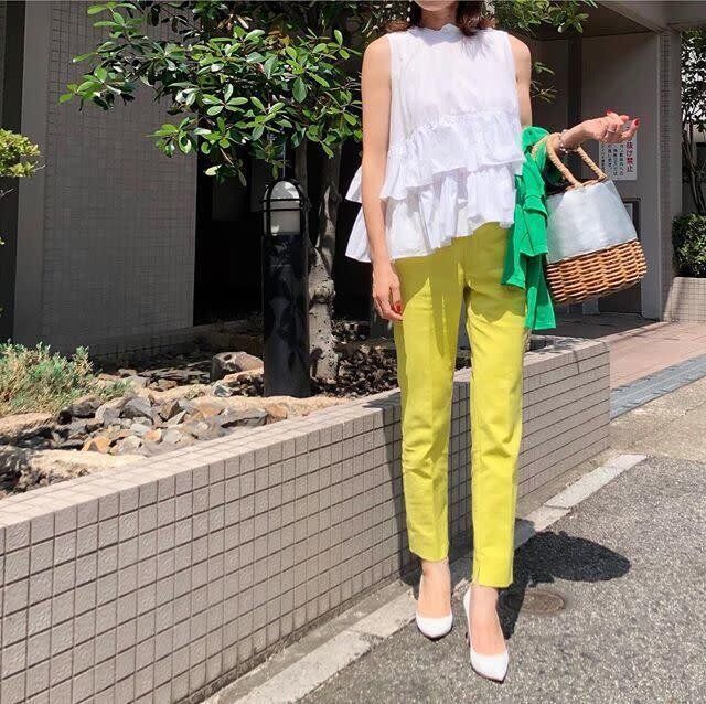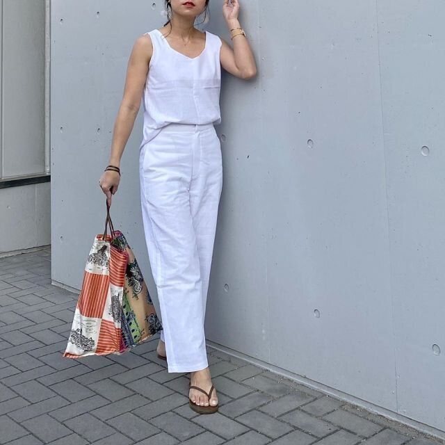 そんなときは「腕はノースリーブでIラインをしっかりつくる」、「トップスを軽くウエストインする」など、カモフラージュすることだけに集中せず、抜け感や身体のシルエットにメリハリを意識するのが◎。