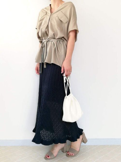 透かし編みスカートに合わせて、大人フェミニンなサファリMIXコーデに。