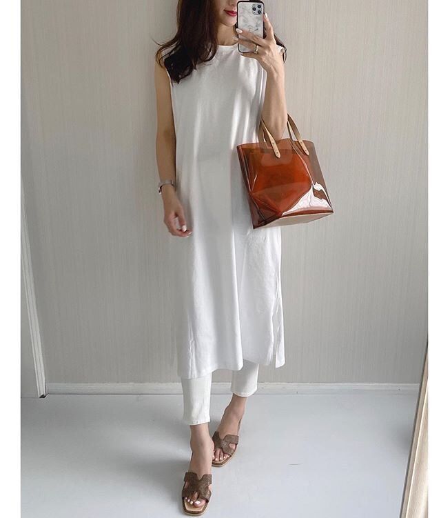 ブラウンのクリアバッグ・サンダルを合わせることで落ち着いた印象に。
