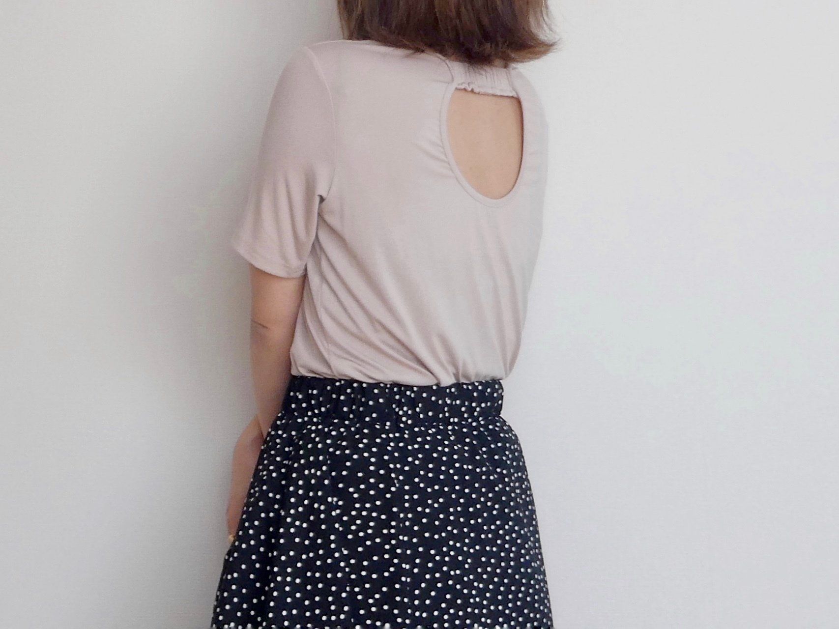 バックシャンなトップスに合わせやすい、後ろの開きがきれいなデザインで、センターに切り替えのおかげで後ろ姿がすっきりと見えるのもうれしいポイント。