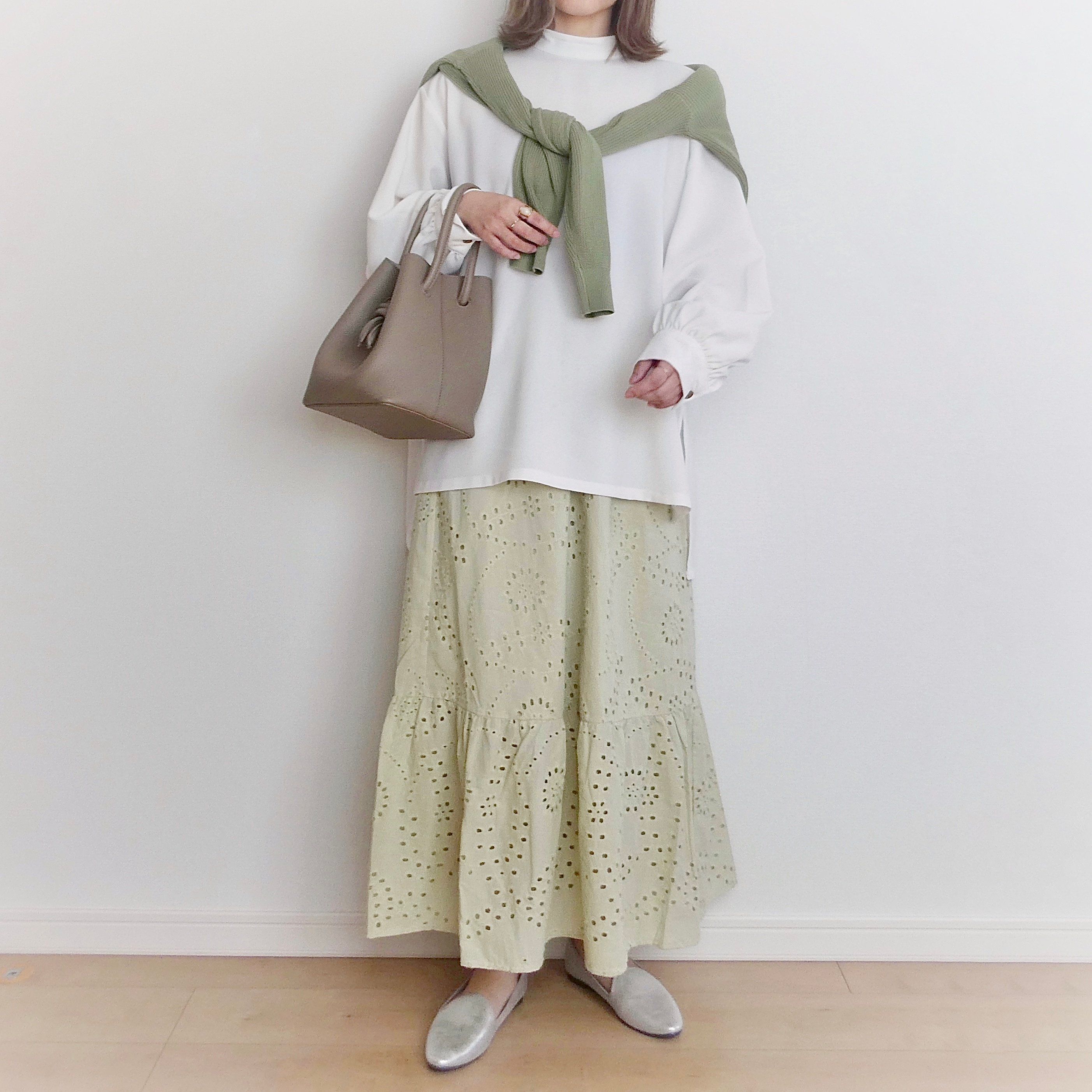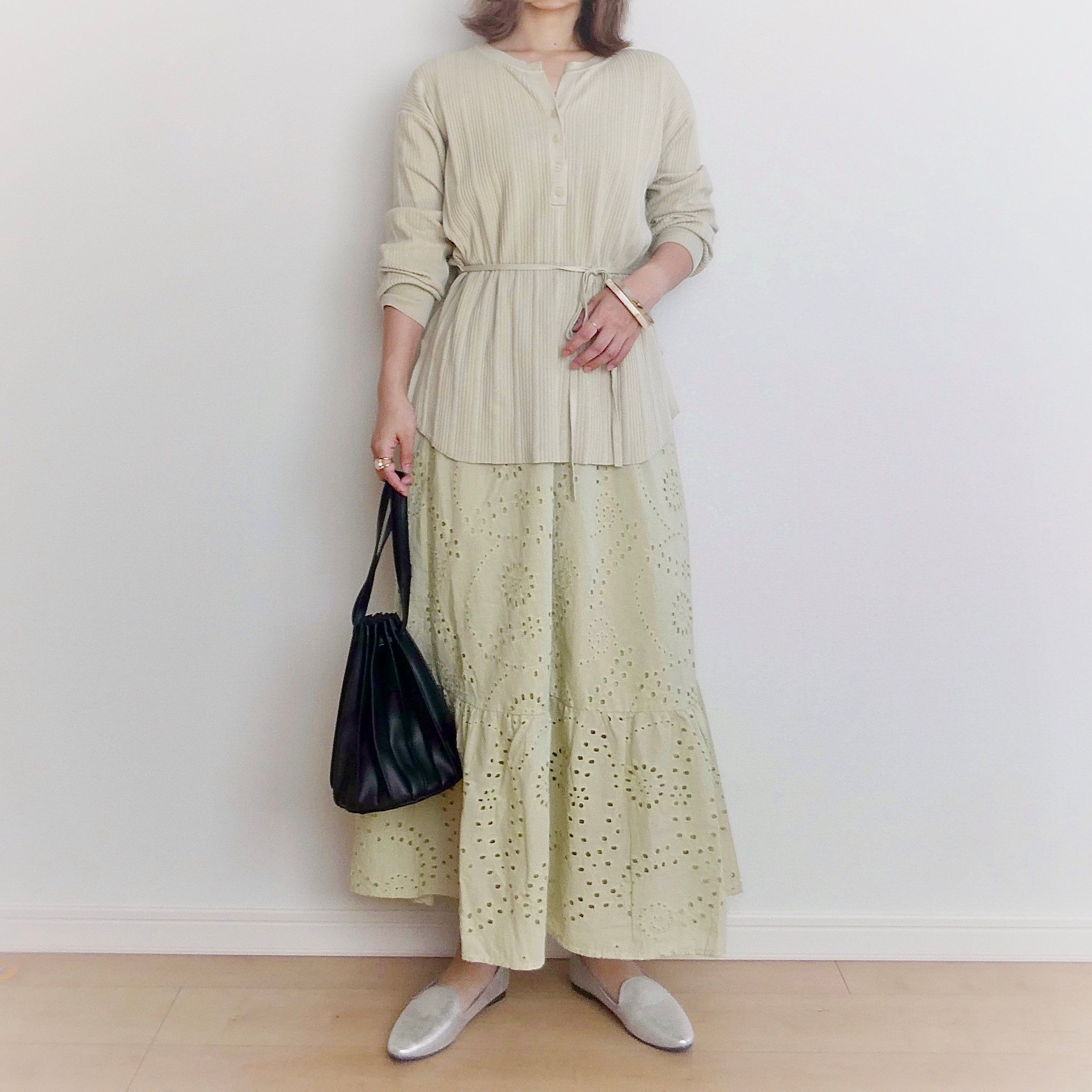 同じカラーのグリーンのトップスを着れば今年トレンドのワントーンコーデの完成です。