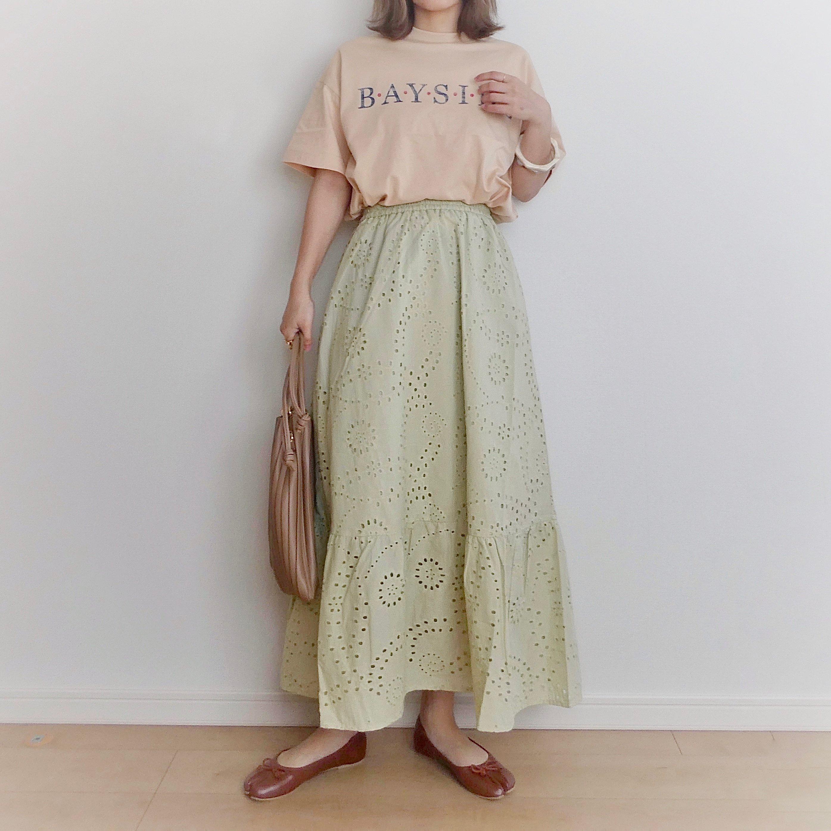 スカートにデザインがあるので、シンプルなTシャツと合わせてもとってもかわいいですよ。少しハイウエストで履けば足長効果もバッチリです。