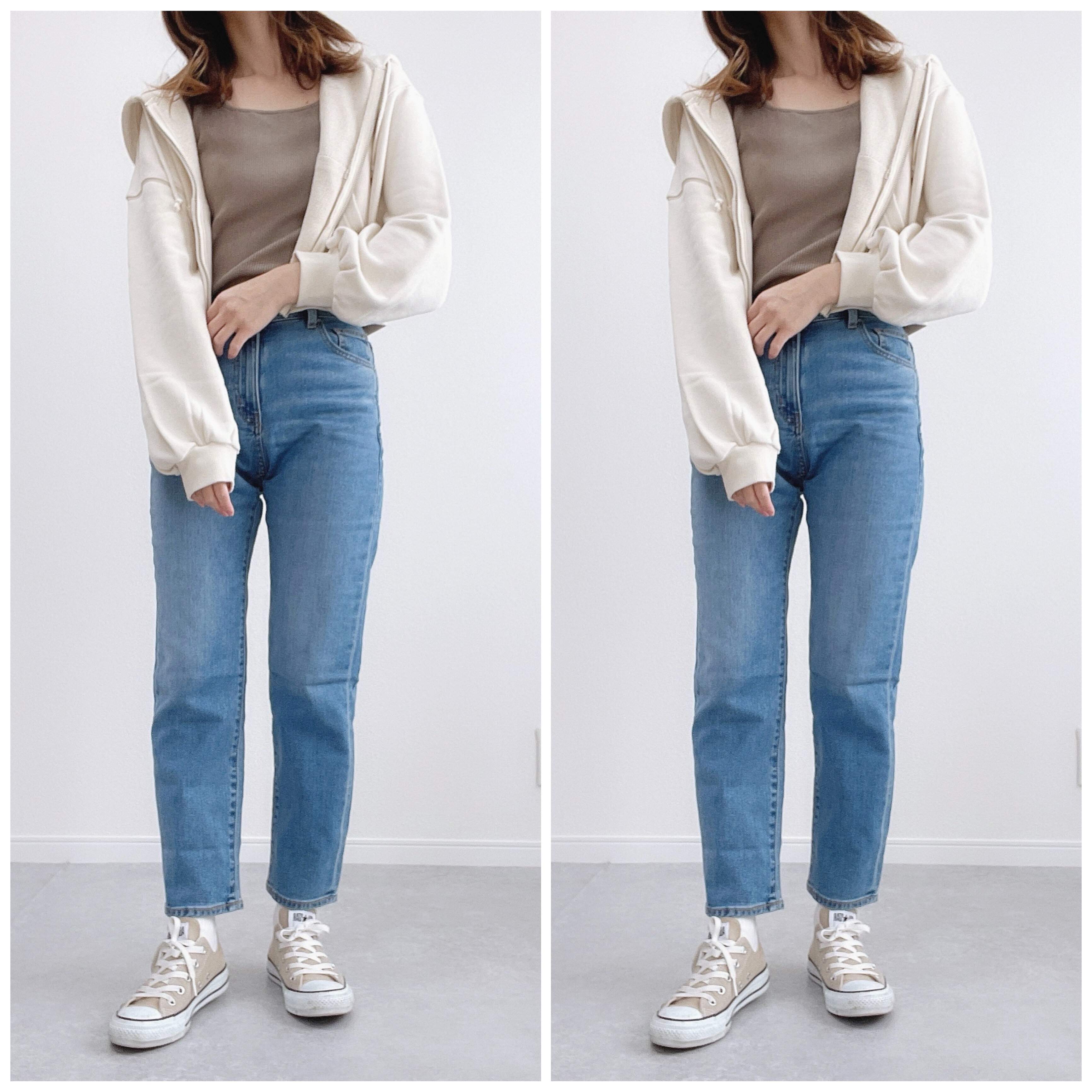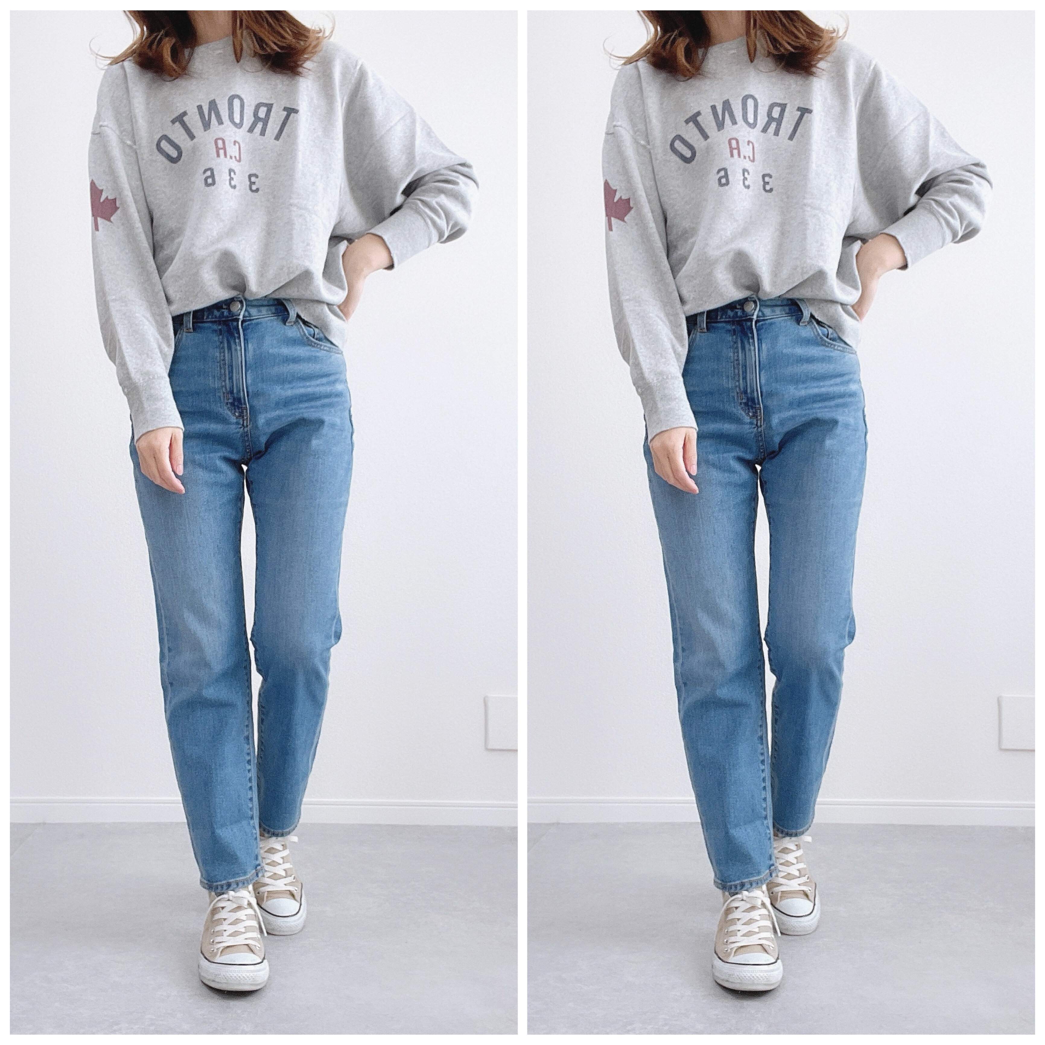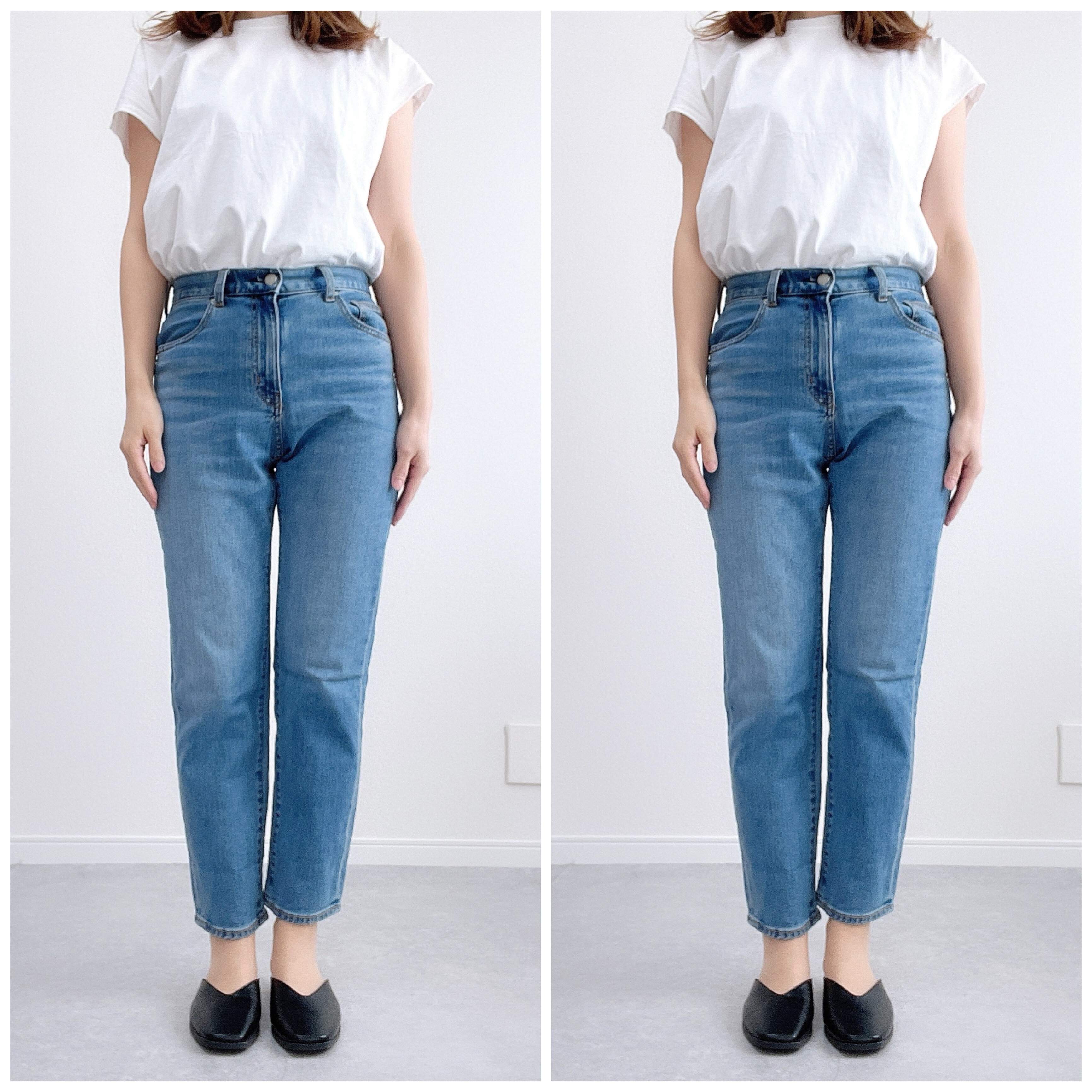こちらのデニムは高評価レビューが多いのと骨格ウェーブの私はテーパードパンツと相性が良いのでずっと気になっていました。それで実際試しに履いてみようと履いてみたら想像以上に履きやすくシルエットも良く骨格ウェーブは嬉しいウエスト位置も高めで即お気に入りになりました。