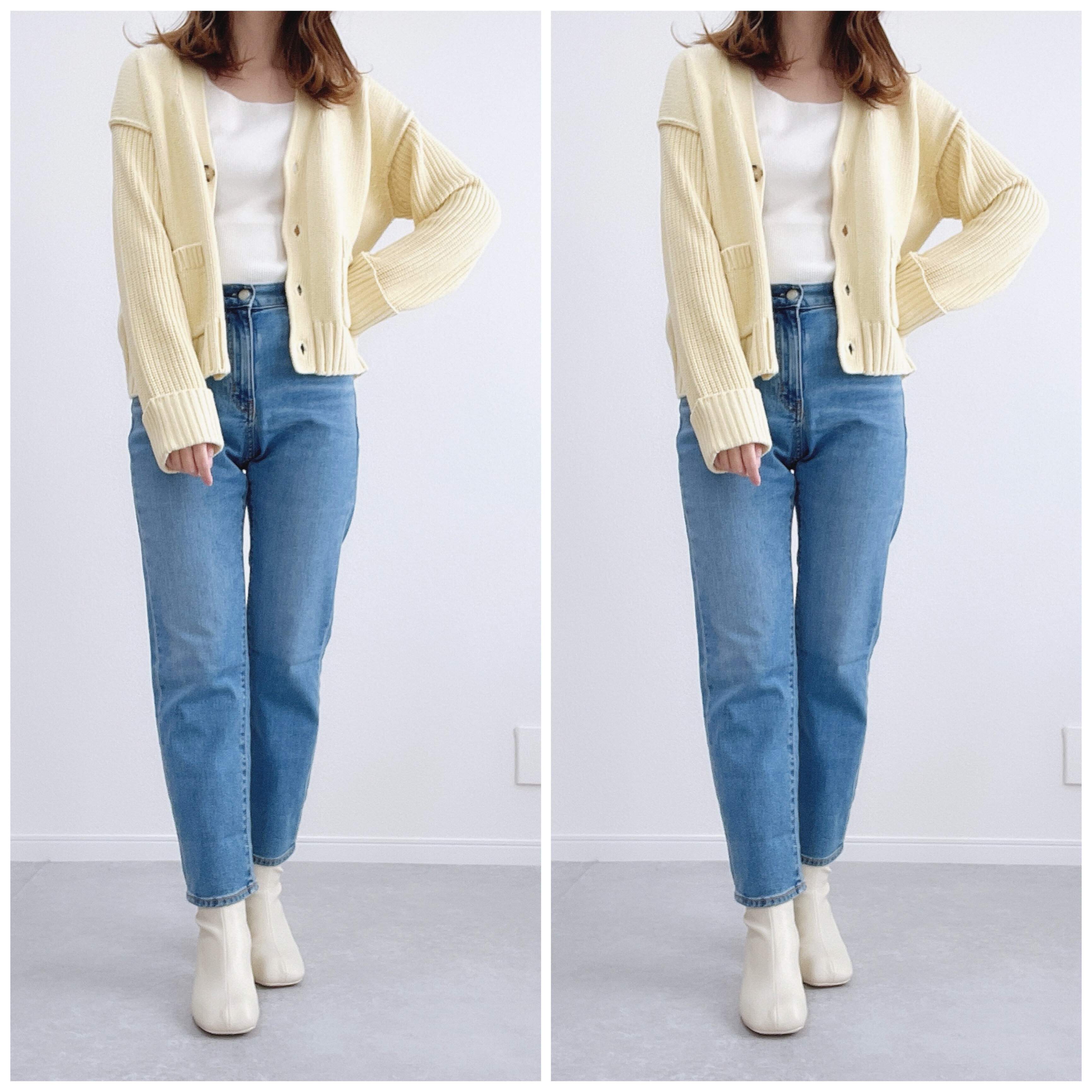 GUの春カラーがかわいいカーディガンと合わせてみました。白色のブーツを合わせてより春らしく。インナーに着ている白のタンクトップは昨年GUで購入したものですが今年もでています。何かと使えるのでおすすめです。