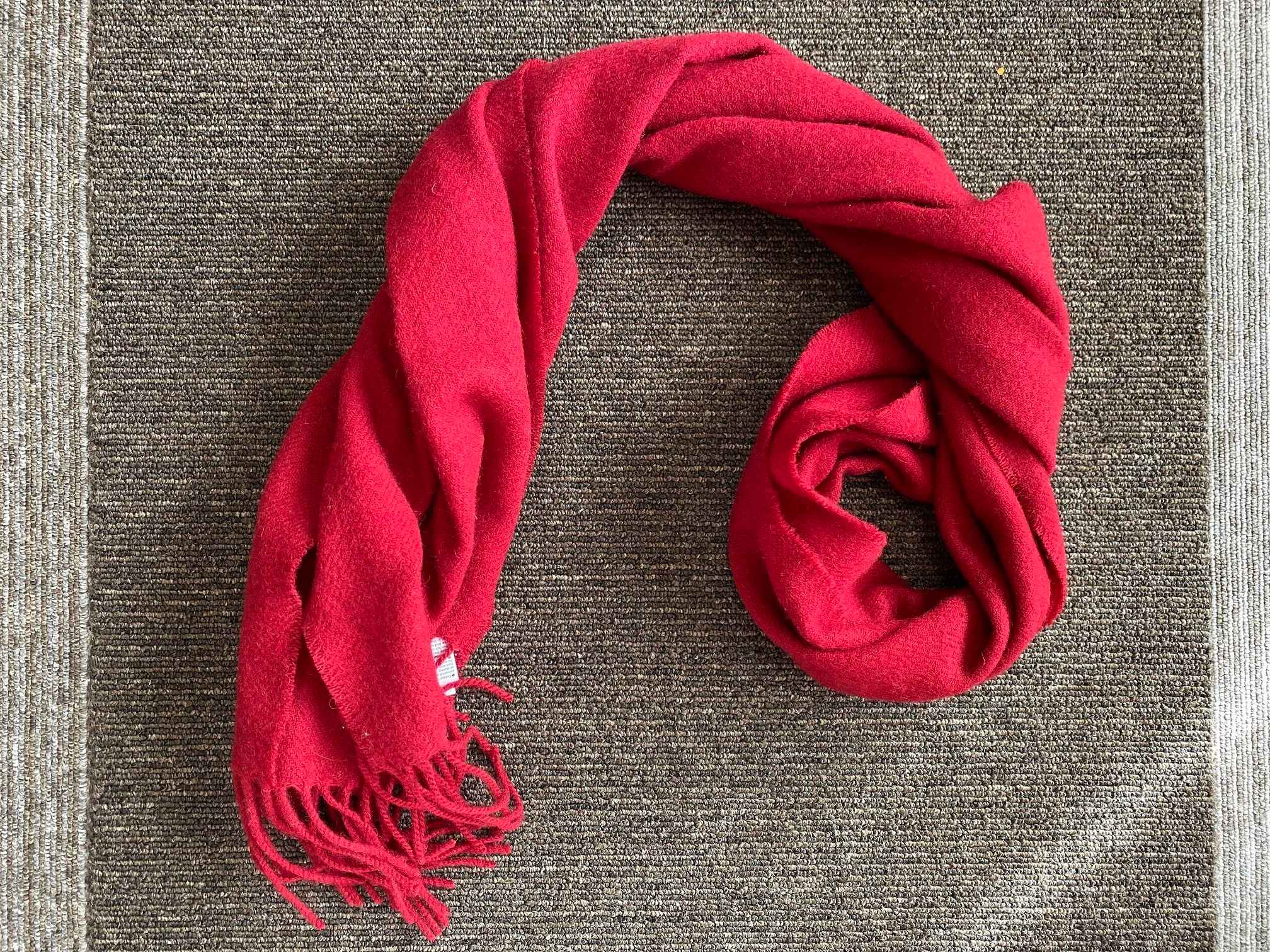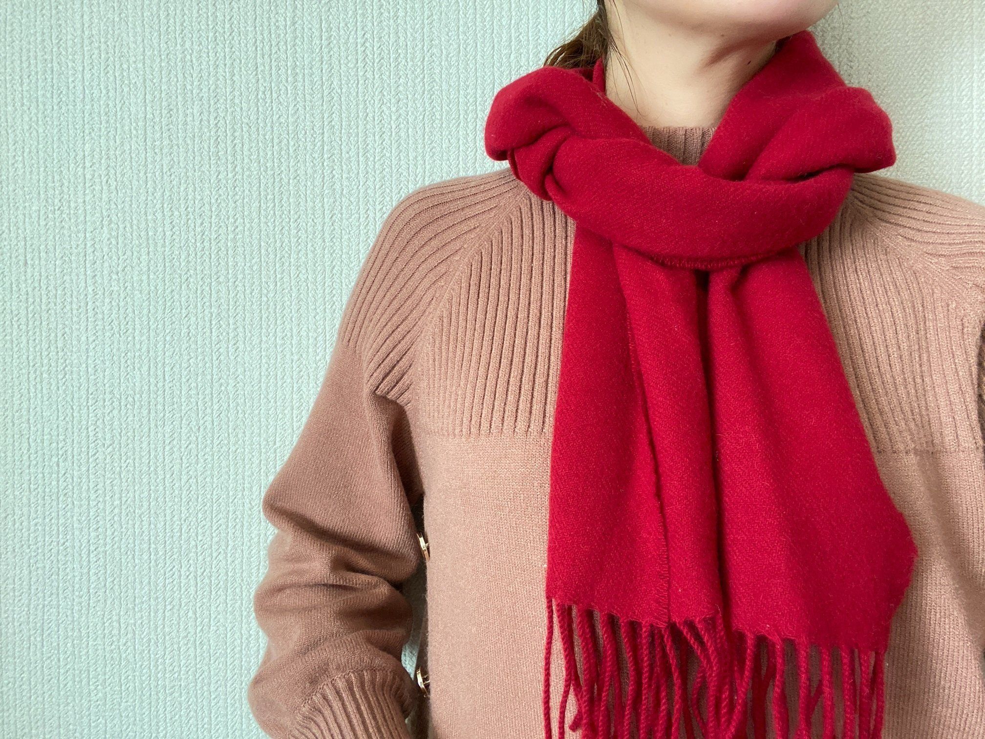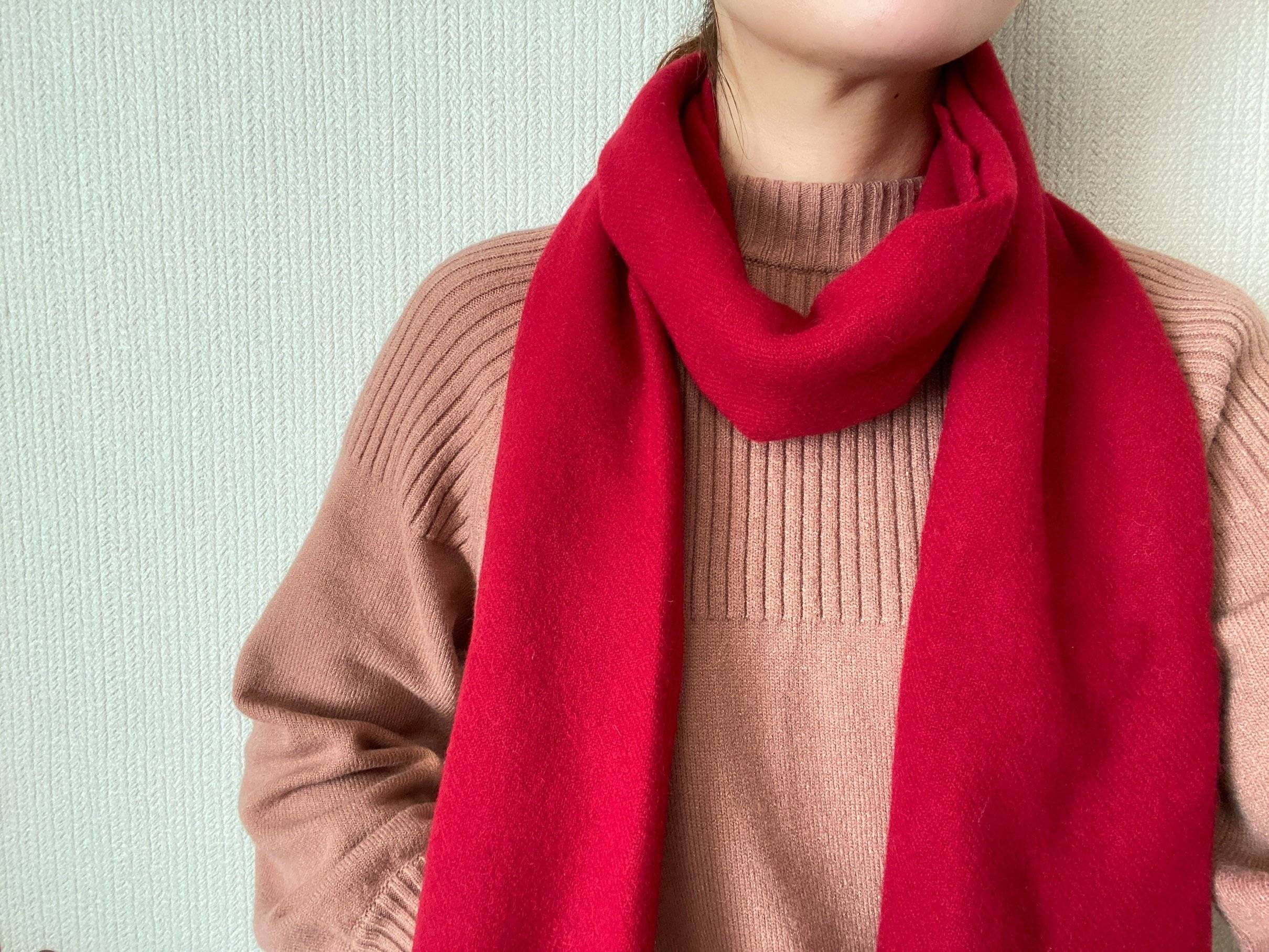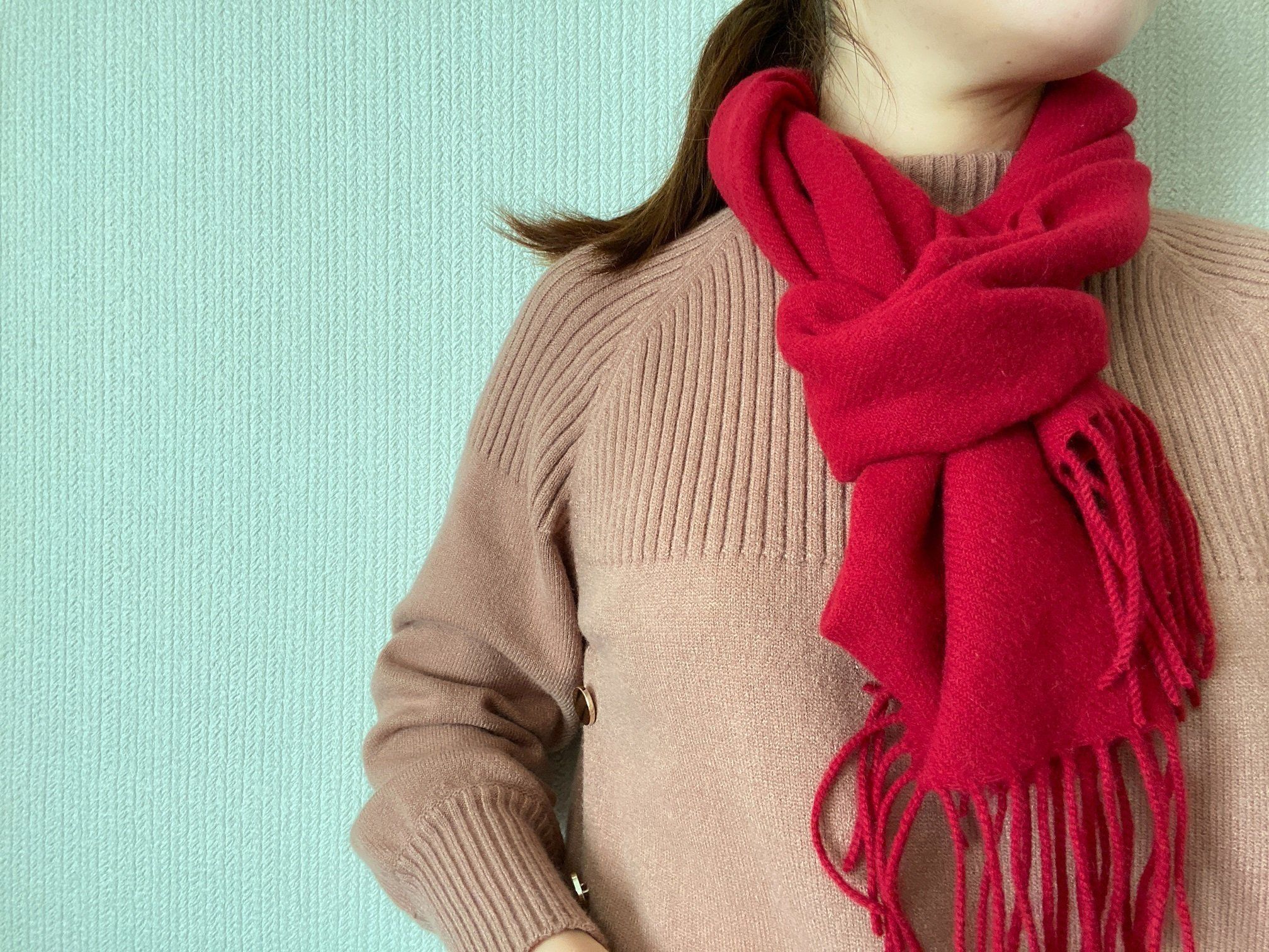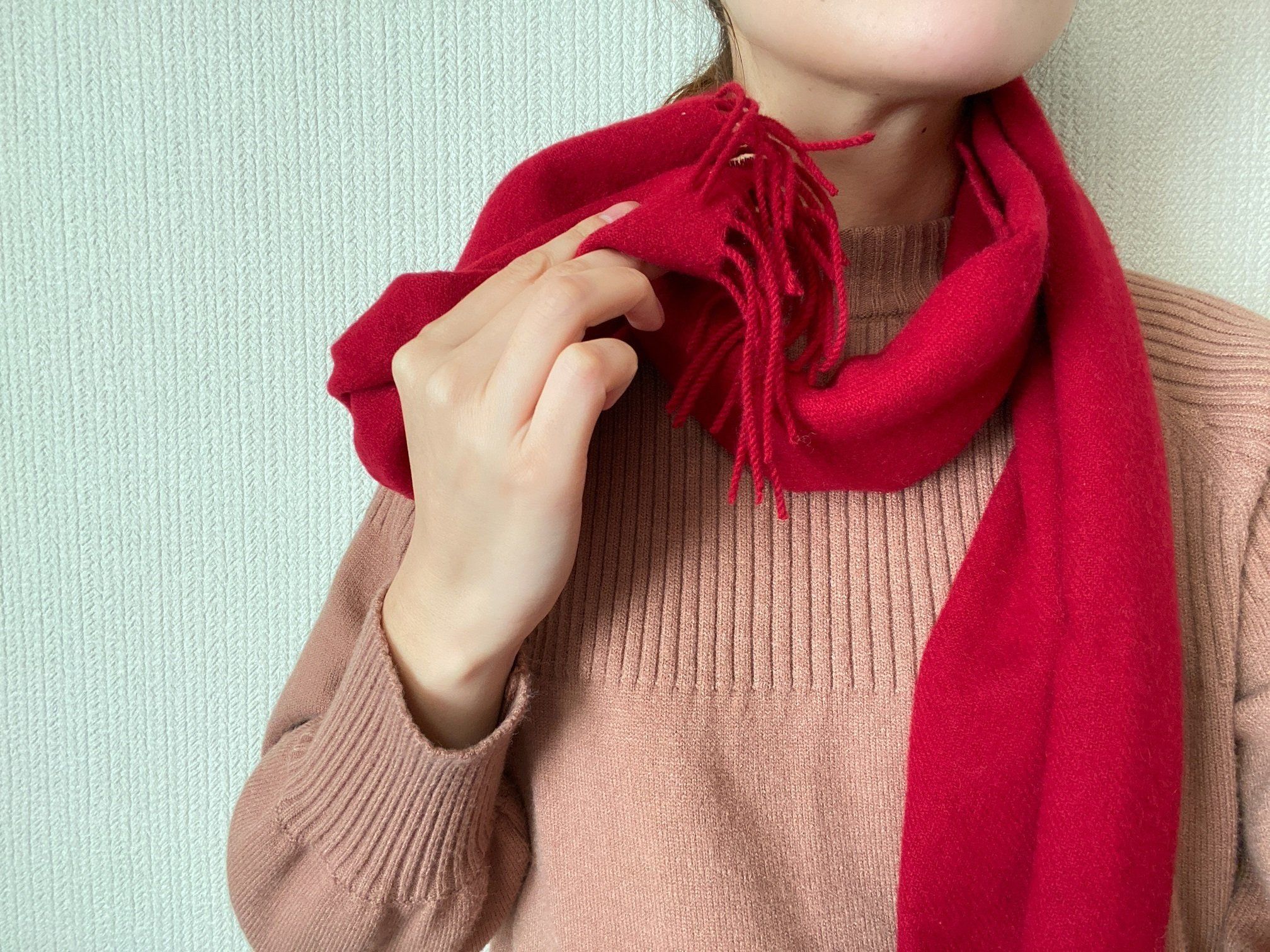 今回のアレンジに利用するのは、無印商品のウール100%マフラー。カラーはダークレッドで、価格は1,990円(税込)です。