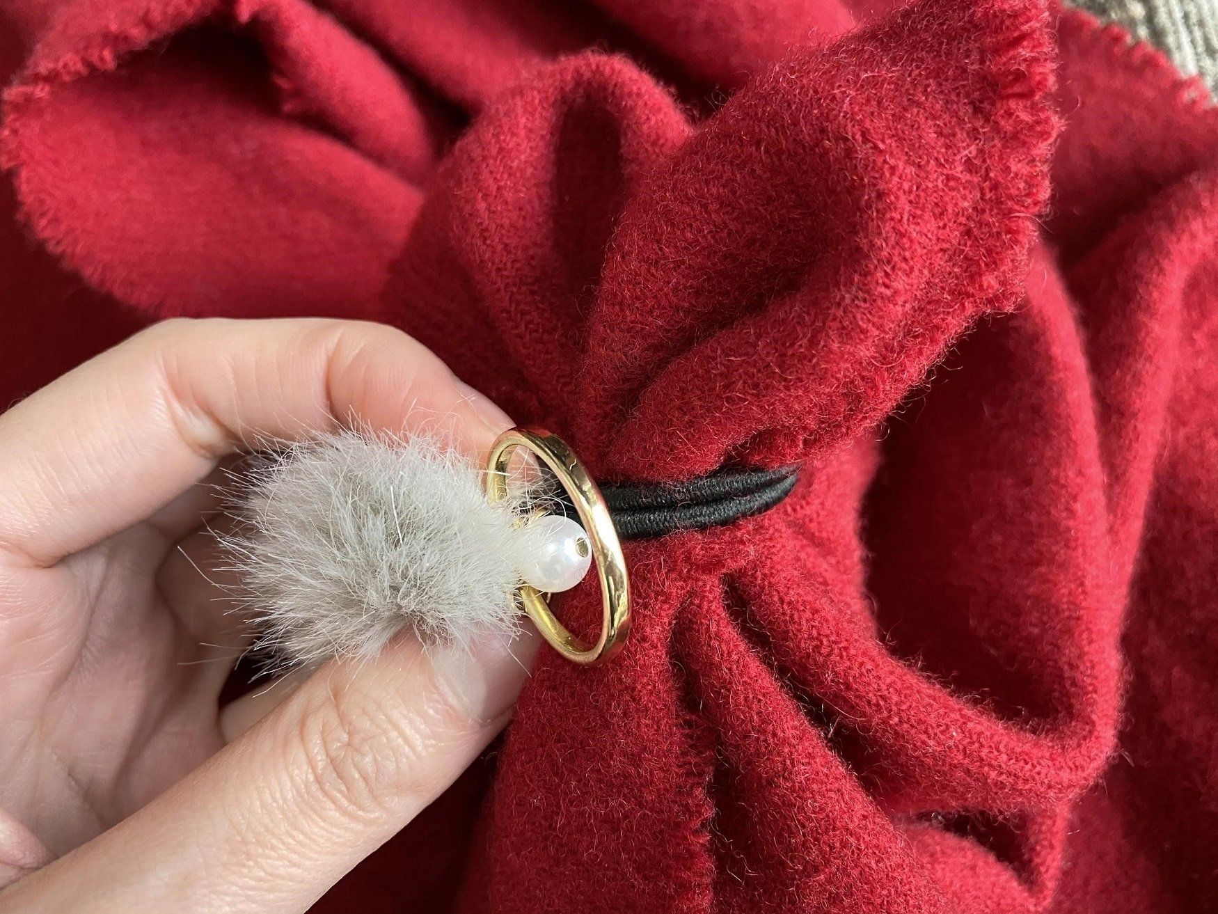 マフラーの端を少しずつとってヘアゴムでしばります。しばったところを広げてリボン風に。このまま首にかけて、形を整えたら出来上がり。