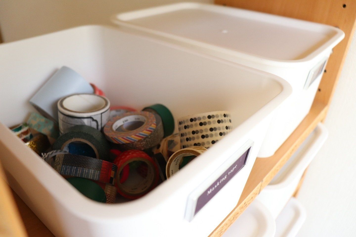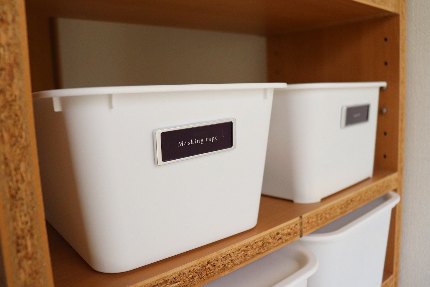わが家ではマスキングテープなどを収納しています。ラベリングしてあげれば、ものも迷子知らず!ふたがセットなのもうれしいポイント。