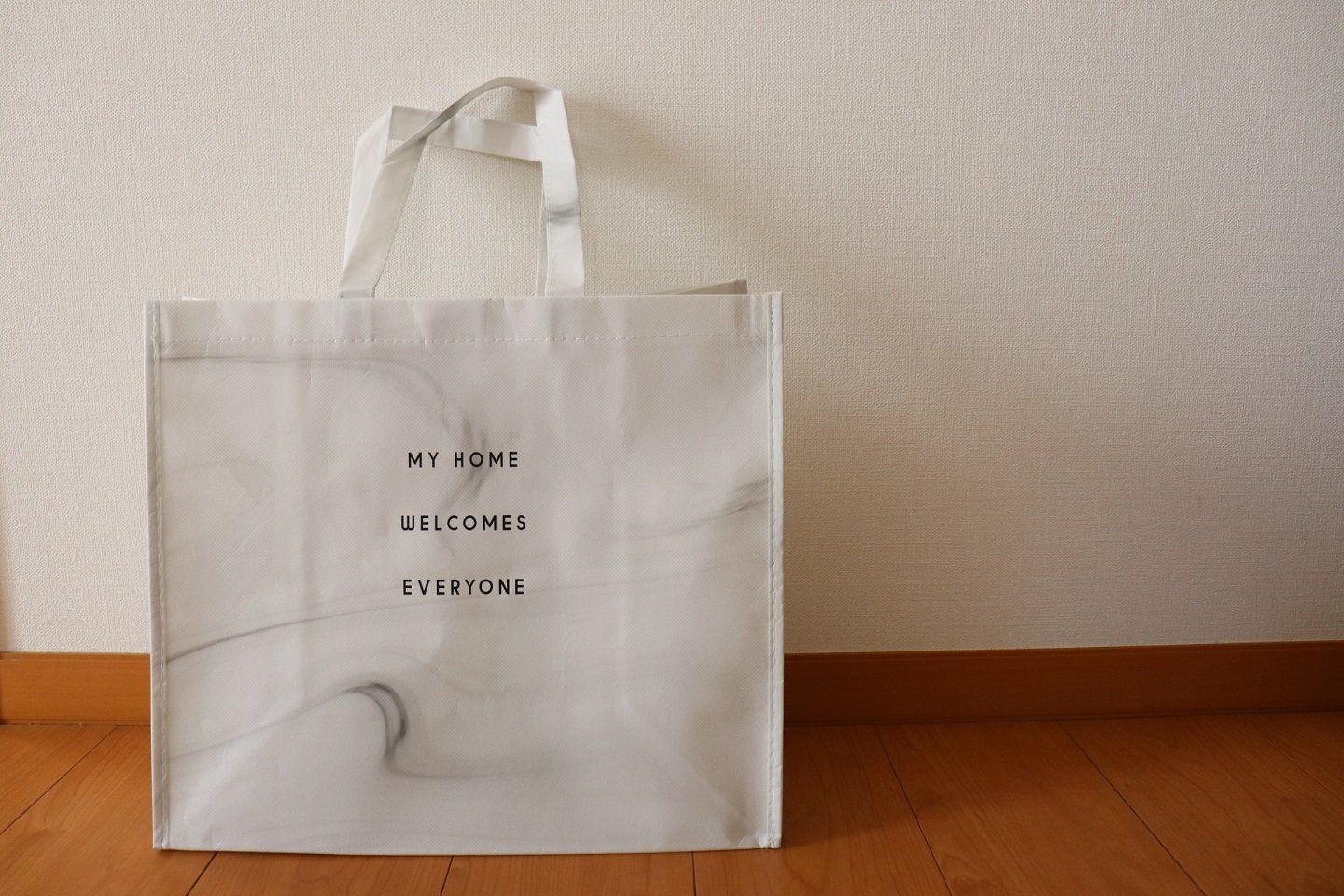 35×40×20cmと大きめなショッピングバック。お店でもらってきた紙袋を収納しておくときなどに便利そうなサイズ感です。大理石の柄とシンプルな英字が、そのまま置いておいてもカッコいい!価格は100円です。