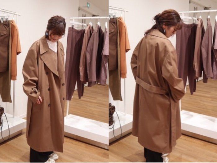 こちらのオーバーサイズのトレンチコートは、じつはメンズアイテム。サンプルはLサイズなので、だいぶ大きいですが、Mサイズなら夫とシェアして着られるかも!