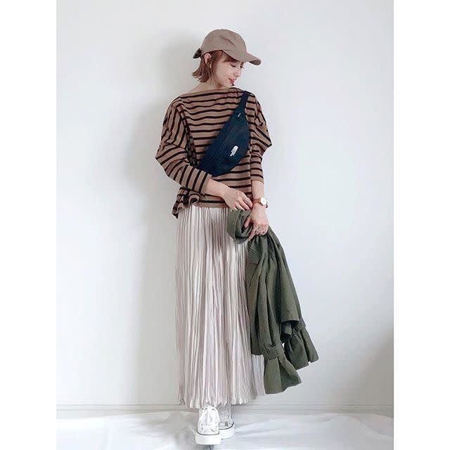 ふだんなら、カーゴパンツやデニムで合わせがちなボーダーも、フェミニン要素の強いマキシ丈のプリーツスカートと合わせれば、体型カバーもOKなカジュアル装いになりますね。カラーも今年トレンドのブラウンでまとめ、キャップでより旬なテイストに。