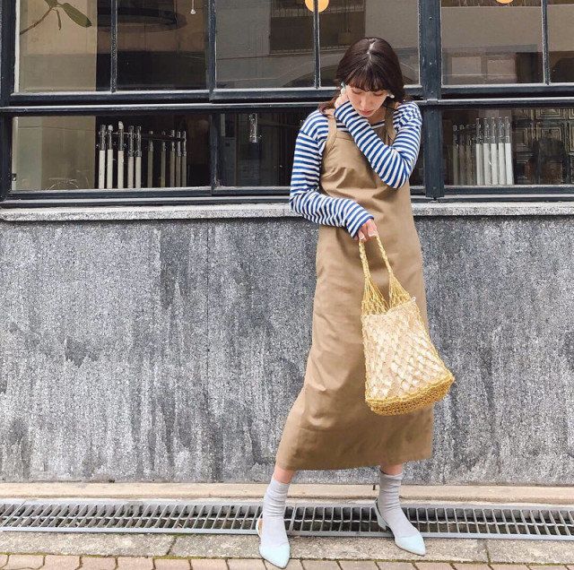 意外と合わせていなかった、ジャンパースカートやサロペットとの合わせ。いわゆるつなぎです。今年の初夏からブレイクし始めたアイテム。大人の休日スタイルには、リラックス感もあっておすすめです。足元もソックス&パンプスにすれば、秋らしいおしゃれ上級者の装いに。