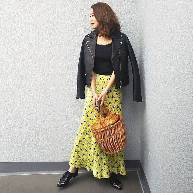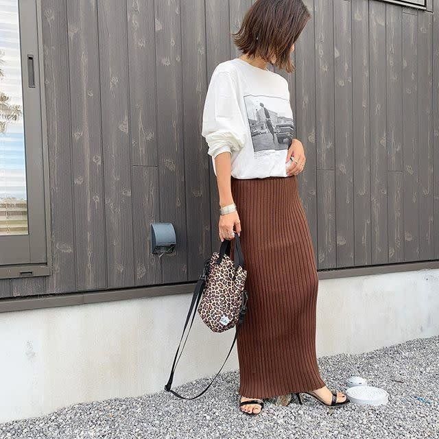 いつもパンツスタイルが多い人なら、ロングスカートで試してみるのがおすすめです。タイトラインなら確実に女っぷりを上げられるアイテム。トレンドのアニマル系バッグをプラスでより旬な女子に。