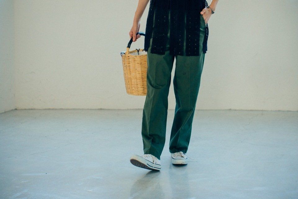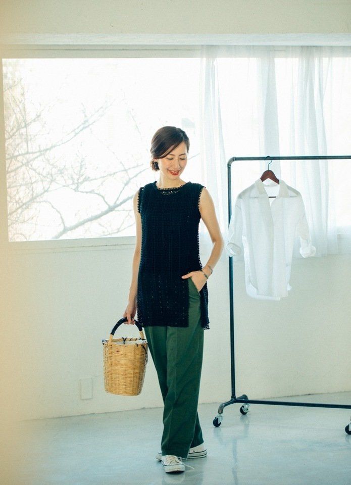 合わせる小物は、ざっくりしたカゴバッグやコンバースなどのローテクスニーカーで「おめかししてます!」感を払しょくし、ラフに仕上げると◎。