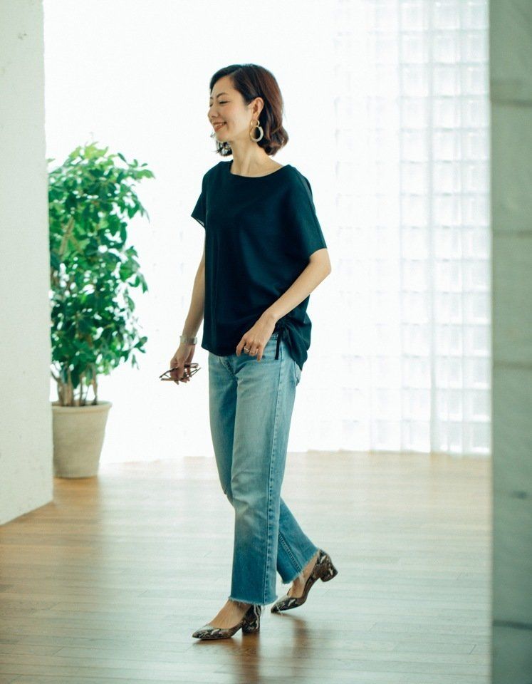 デニムパンツ×コットンのTシャツのような、カジュアル×カジュアルの着こなしがサマになるのは、若者とひと握りのおしゃれ上級者だけ。40代を過ぎたら、デニムこそエレガントな着こなしを意識してみてほしいと思います。