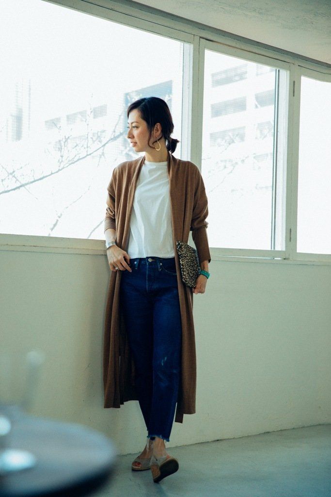 トレンドのロングカーディガンや仕事用のジャケットを着るとき、中にシャツやフェミニンなカットソーをあわせると「なんだか野暮ったい」と感じることはありませんか?そんなときは、インナーを白いTシャツに変えてみてください。それだけで、力が抜けた“こなれ感”のある着こなしに見えるはずです。