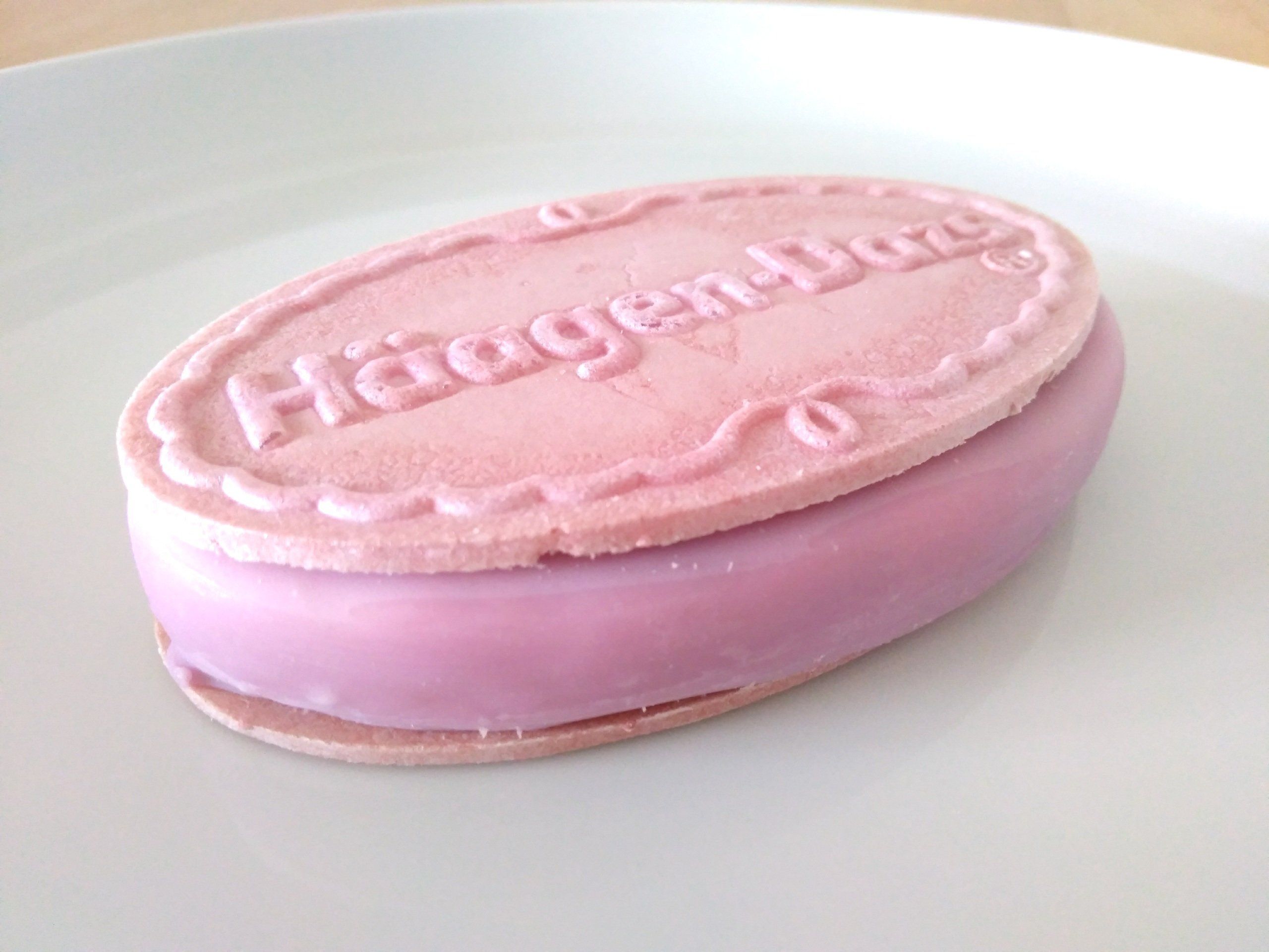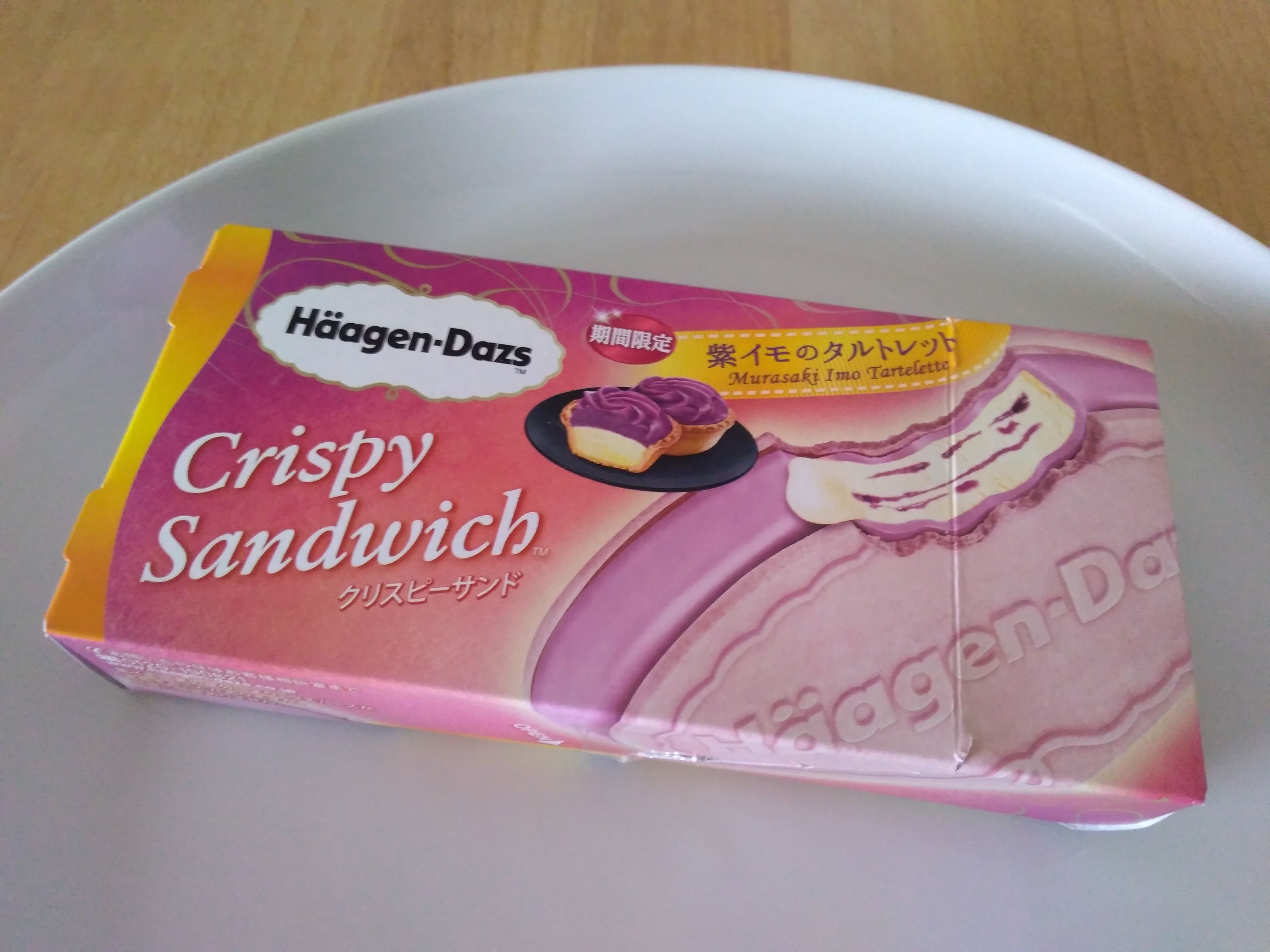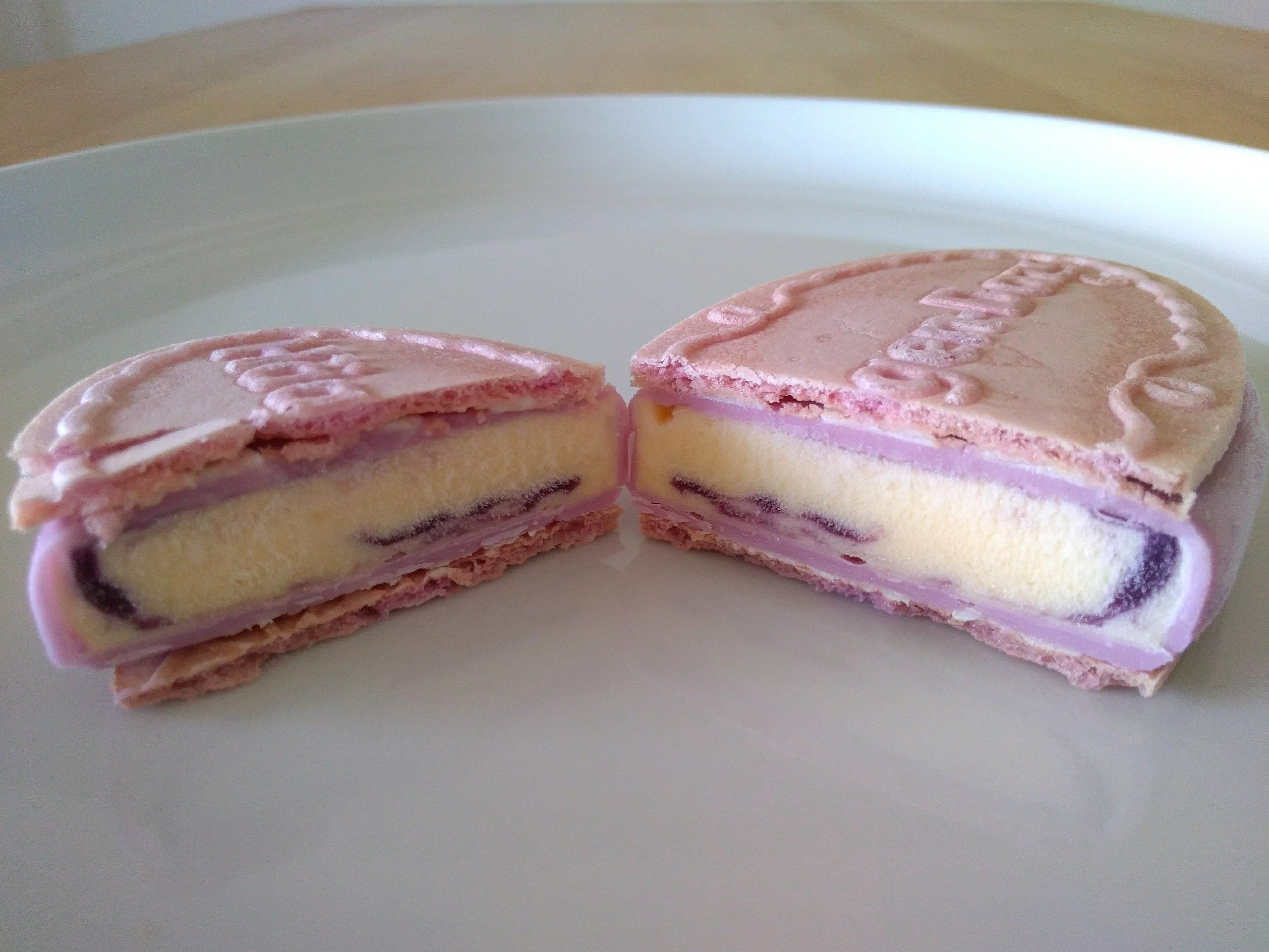 「紫イモソース入りのカスタードアイスクリームを、パリッとした紫イモコーティングで包み、紫イモパウダー入りサクサクウエハースで挟んだ」とのこと。なんてキレイな紫色なんでしょう!
