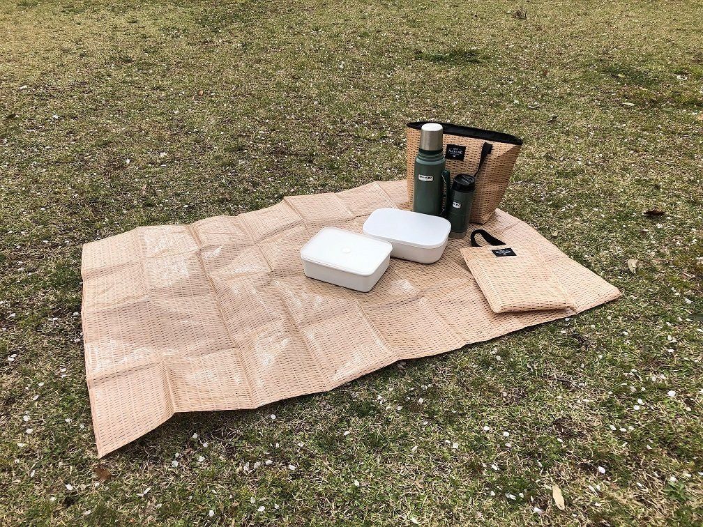 クーラーバッグと同じく、かごバッグ風デザインのレジャーシートもカインズで買えます。こちらも298円(税込)とお手頃価格!