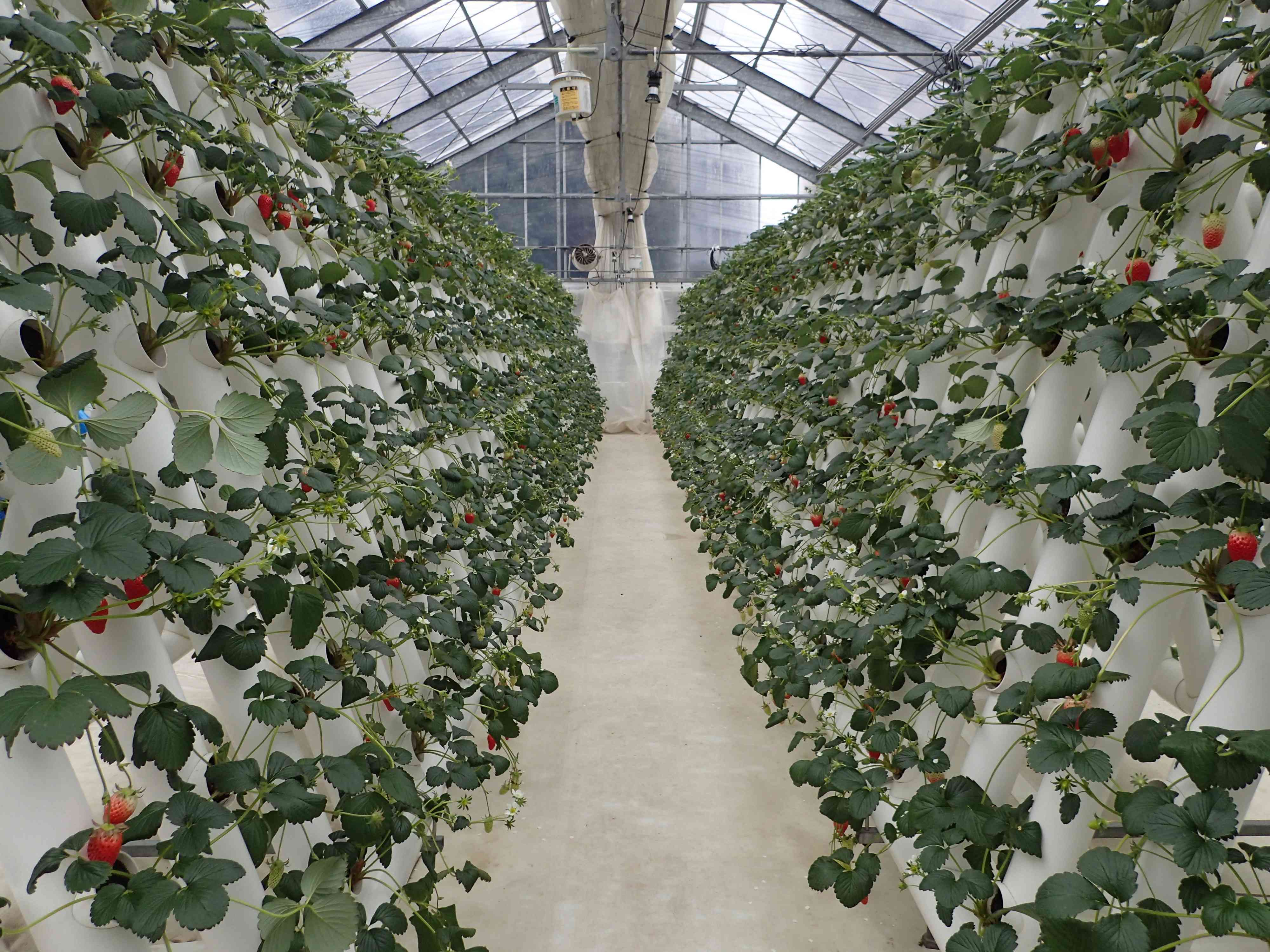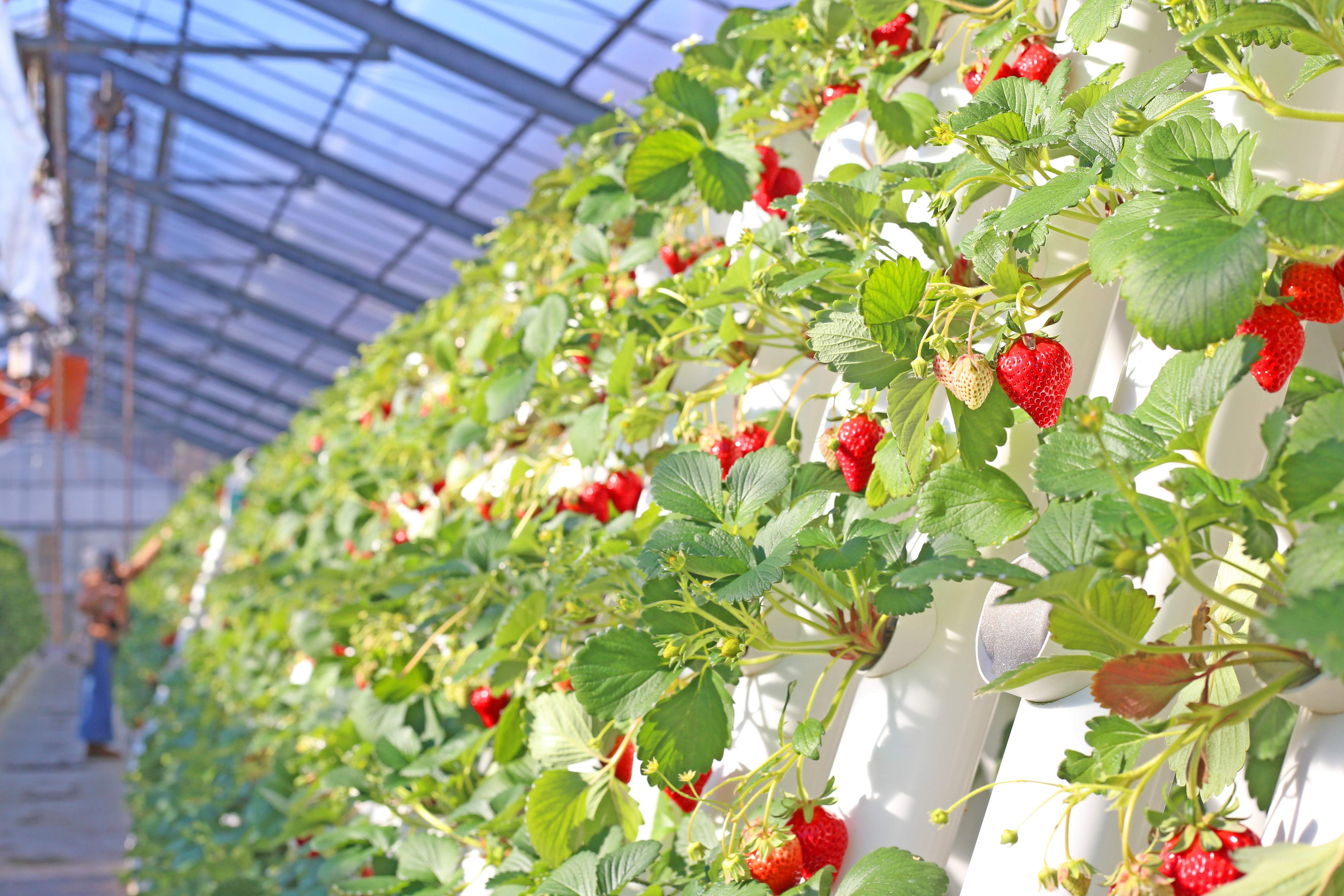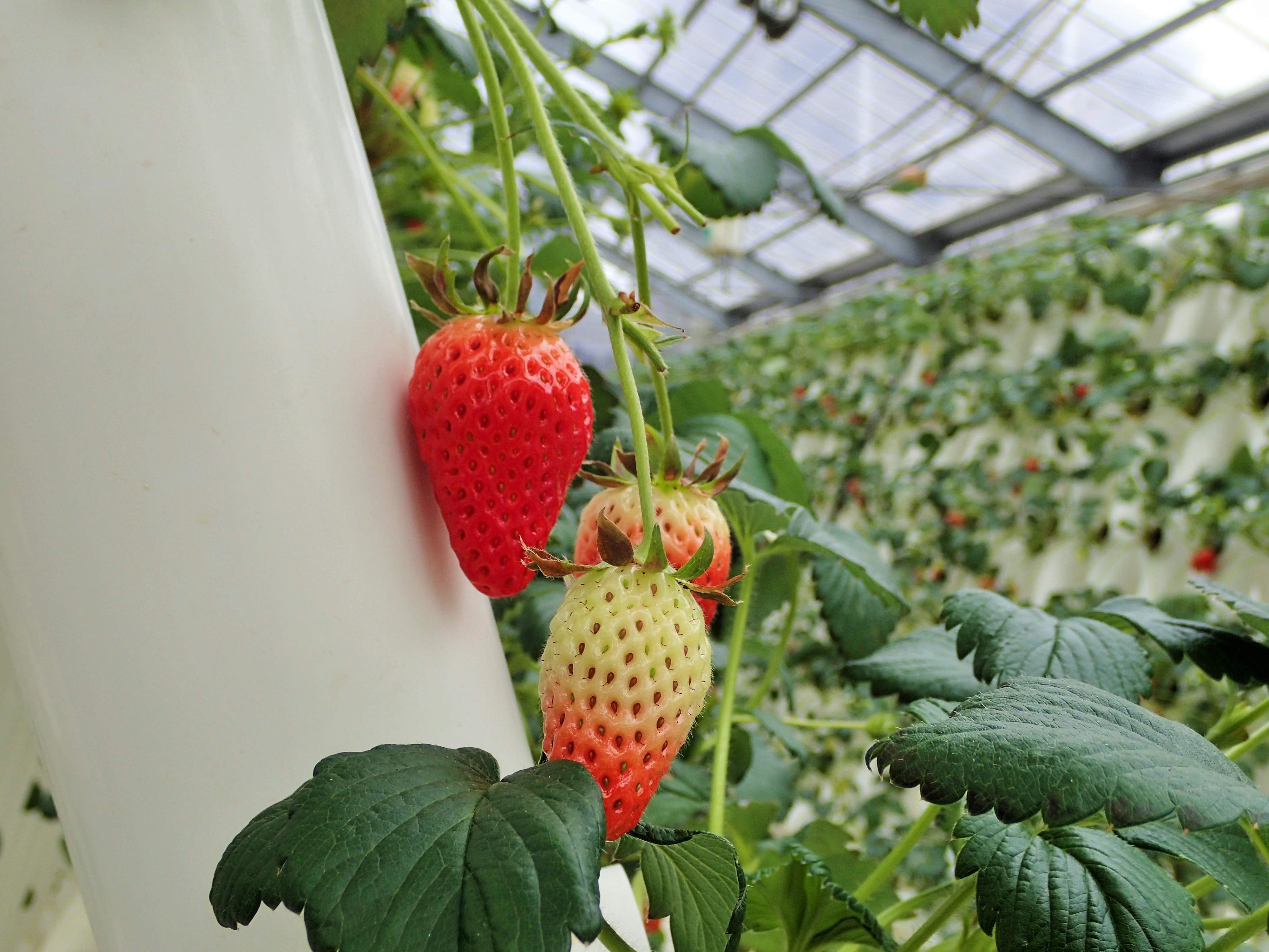 いちご狩りの畑は「立体型7段式水耕栽培」で、立ったまま摘み取りが可能。食べ放題ではなく量り売り方式で、摘み取ったいちごの量で料金が決まります。予約不要、受付先着順で、熟したいちごがなくなり次第終了です。