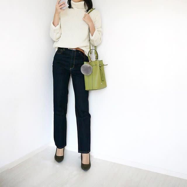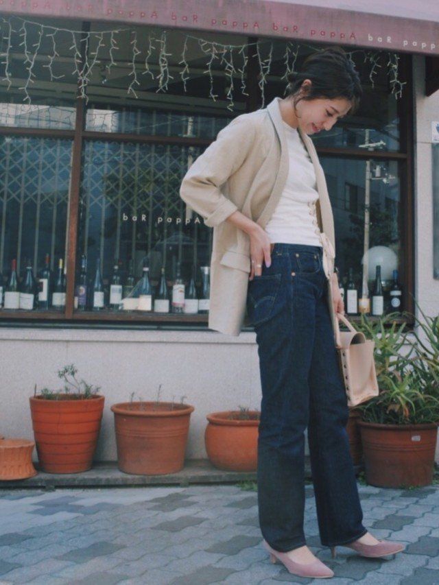 写真のようにインディゴデニムなら、どんなカラーのトップスを合わせても、コーディネートのアウトラインがキリっと締まった「お仕事デニム」コーデに。