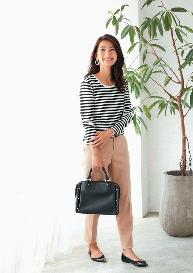 細ピッチ&細身シルエットのボーダーTシャツが、オンにもオフにも使えて◎。さらに、きれいめボトムスや小物と合わせれば簡単に「大人カジュアル」が完成。「手首見せ」で女度UP。