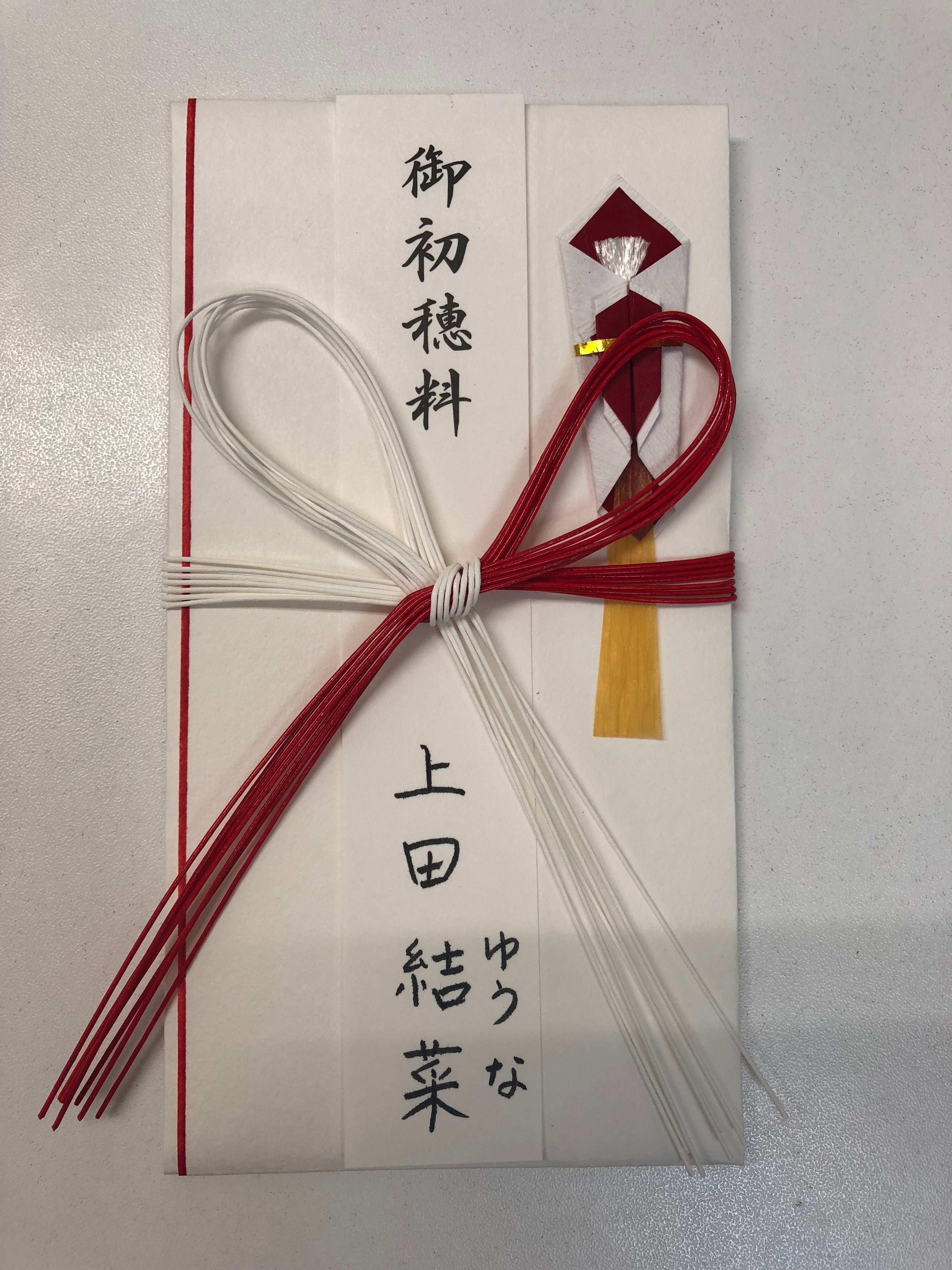表書きは、神社なら「御初穂料」「御玉串料」、お寺なら「ご祈祷料」「お布施」などになります。下段の名前は、子どもの名前をフルネームで書きます。読みにくい名前の場合は、ふりがなをつけておきましょう。