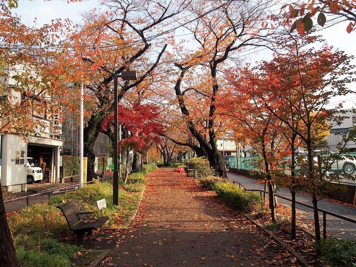 桜の葉が色づいたものを桜紅葉(さくらもみじ)といい、東京では11月の中旬から下旬まで楽しめます。桜並木のあるところならどこでも大丈夫です。歩きながら鑑賞するなら呑川緑道がおすすめです。全長14.4キロメートル、世田谷区から大田区にかけての緑道です。ベンチや遊具などもあるので、家族でお散歩できますよ。