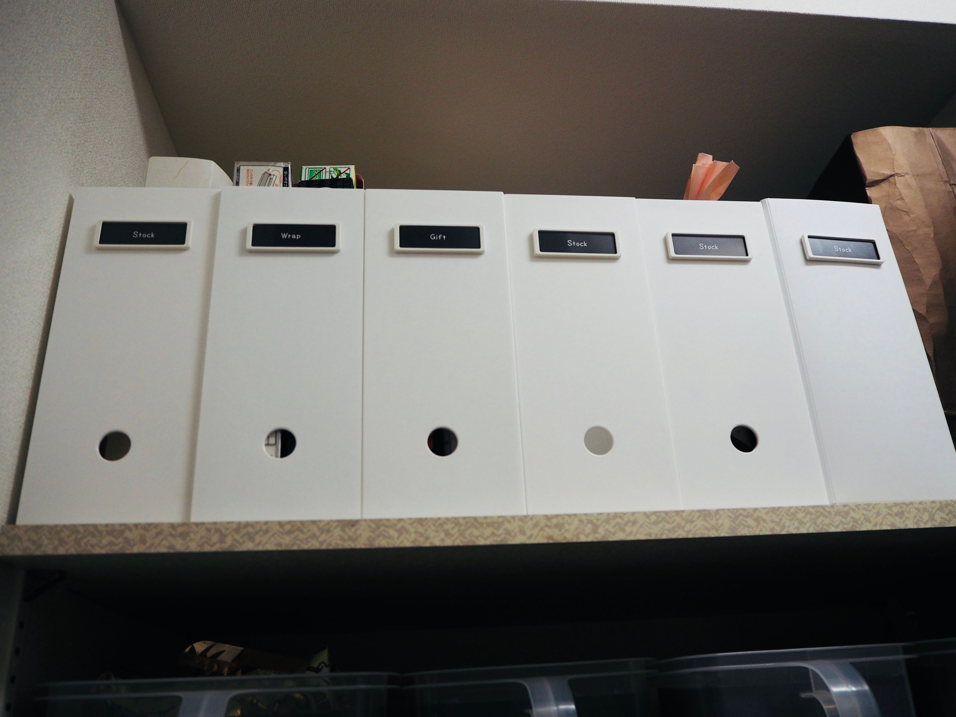 アルミホイルのストックやいただきものや贈り物など軽いストック品、通販で購入し、使う時期を待っているものなど出し入れ頻度が低いモノはすっきり印象を優先し、持ち手や凹凸の無いスッキリフォルムのA4ファイルケース(オールホワイト)を使用。価格もうれしい370円(税別)です。