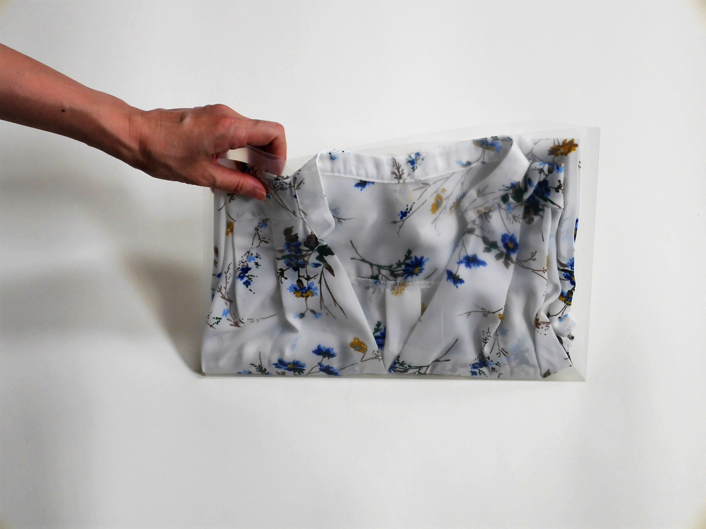 人気の“とろみ素材”のブラウスは、ハンガーに掛けるとスルッと落ちやすいのが難点。たいていのものはシワがつきにくいので、こちらも小さくたたむことをおすすめします。