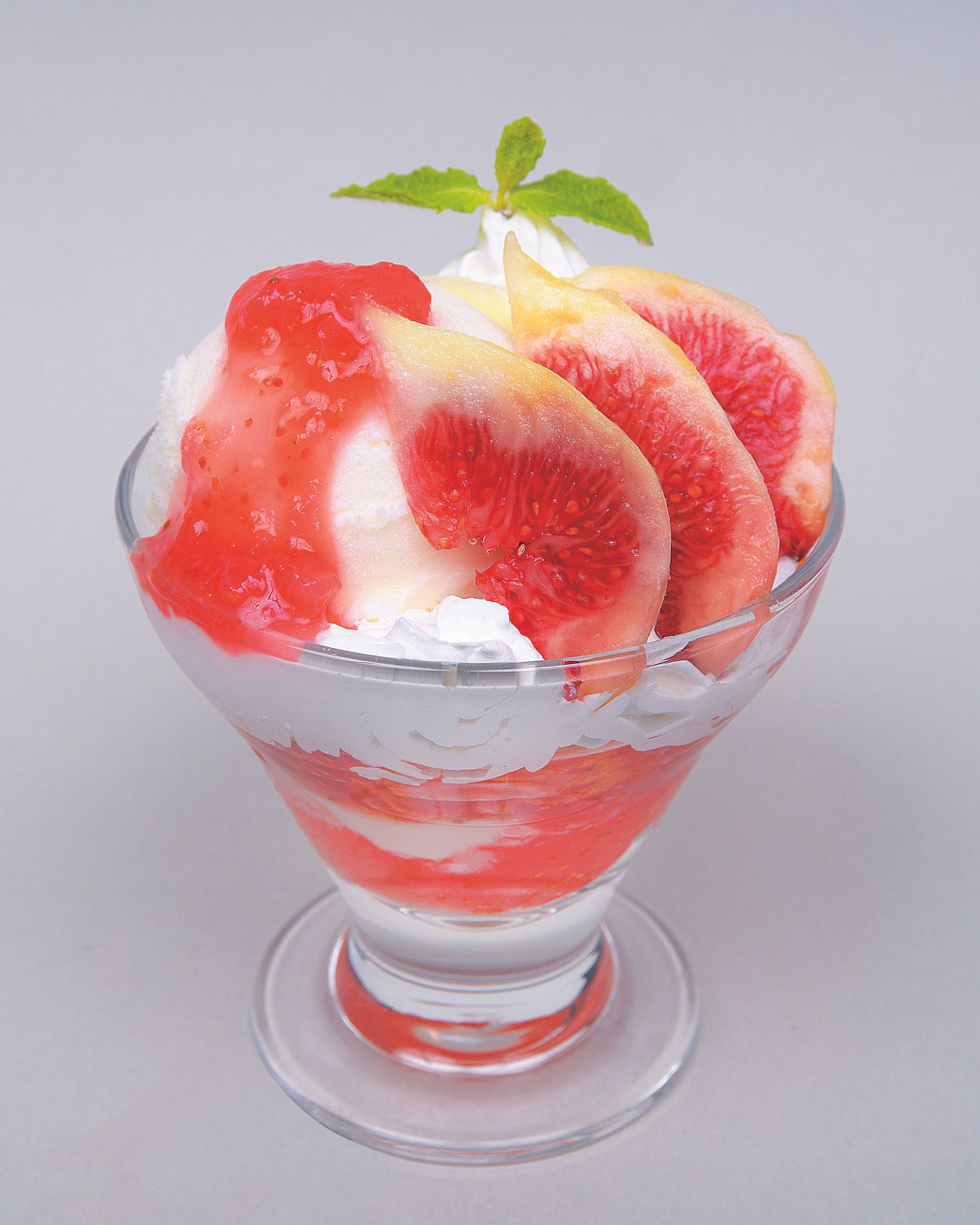 ミニサイズなのに、いちじく、ホイップ、コーンフレーク、ゼリー、塩アイスと多彩な内容。全体にやさしい甘さが特徴。