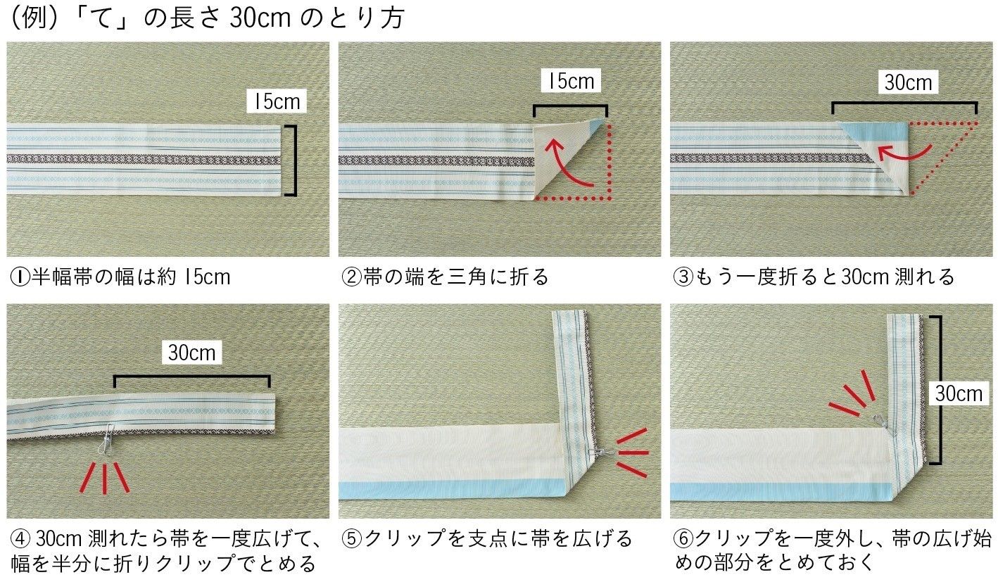 半幅帯は、結びの種類によって最初に必要な「て」の長さが異なります。半幅帯は幅15cmのものが多く、上図のように端から三角に折りたたんでいくことで、メジャーや定規を使わなくても簡単におおよその長さを測ることができます。