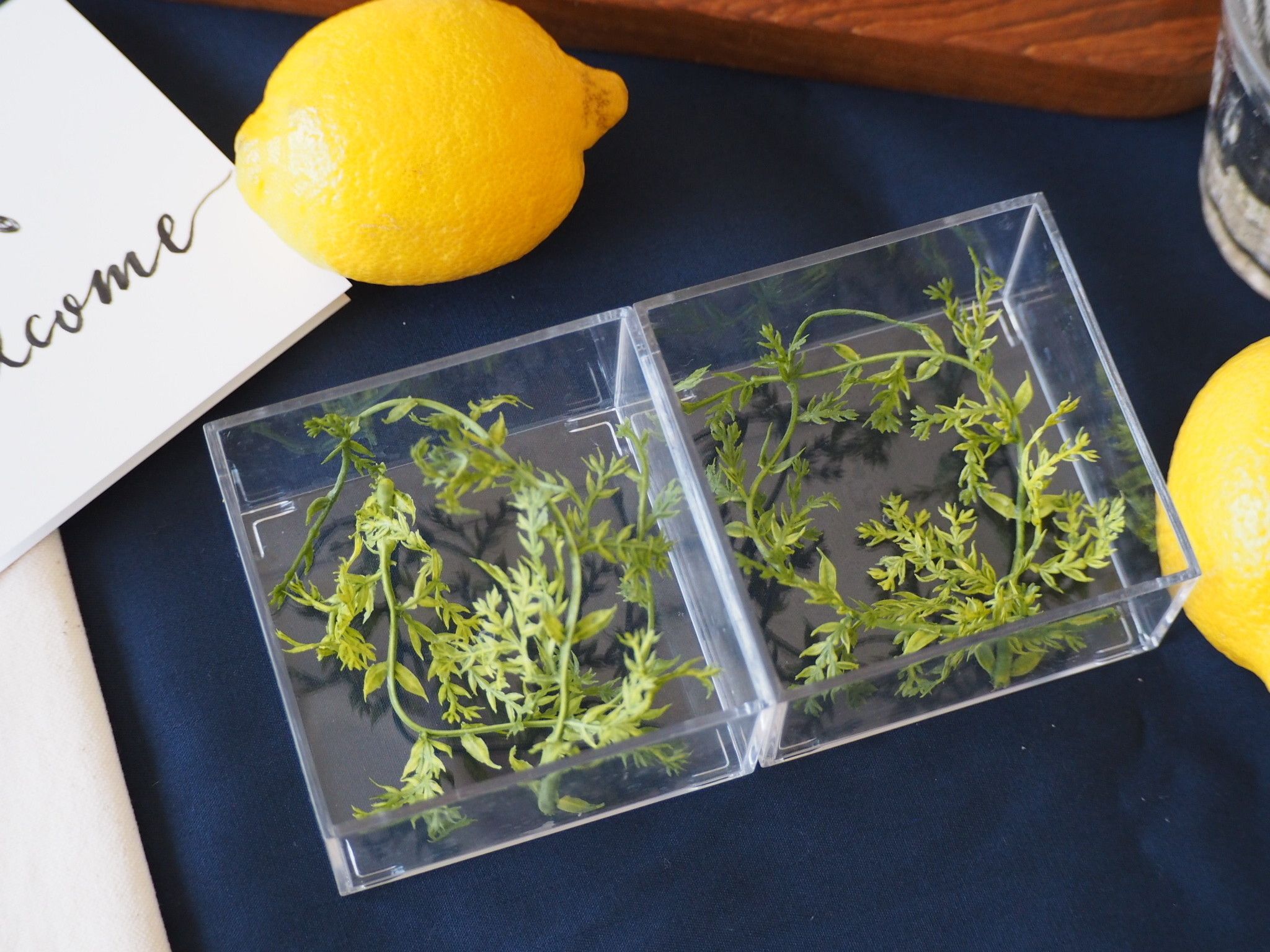 テーブルの上に少し高さを出したいときはキューブボックスの上にキッチンボードを重ねて。キューブボックスの中にグリーンや貝殻などを入れればキッチンボードから透けて爽やかな印象に。