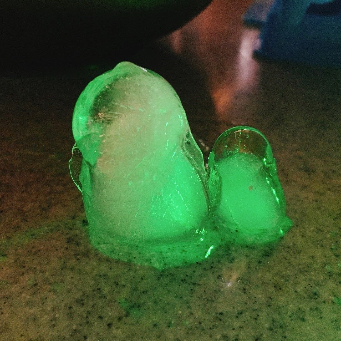 「ファミリーズ」は、雪だるまの親子と丸い氷が楽しめる商品。作り方は前述したとおり、水を入れて型押し用のふたをするだけです。2~3時間、冷凍庫で凍らせた「ファミリーズ」を取り出してみると……そこには夢にまで見た雪だるまの姿が! さらに大小の雪だるまを並べて、背後からLEDの光を当ててみると……。