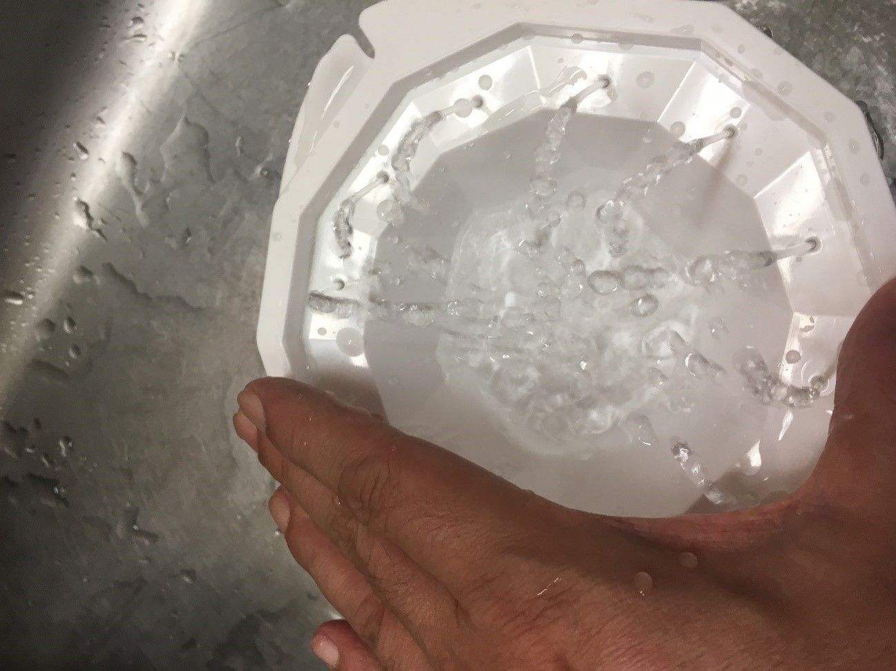 ゆきポン「氷のうつわ」は、オシャレなお店で見かけることがある、氷の食器を作れるアイテム。こちらも型押しタイプの製氷皿で、型押し用のふたをすると余分な水がシュワ―とでてきます。余分な水がふたの上に溜まりますが、そのまま冷凍庫に入れるのが綺麗な氷のうつわを作るポイント。冷凍庫に「氷のうつわ」を入れてから3時間、仕上がりにワクワクしながら取り出してみました……。