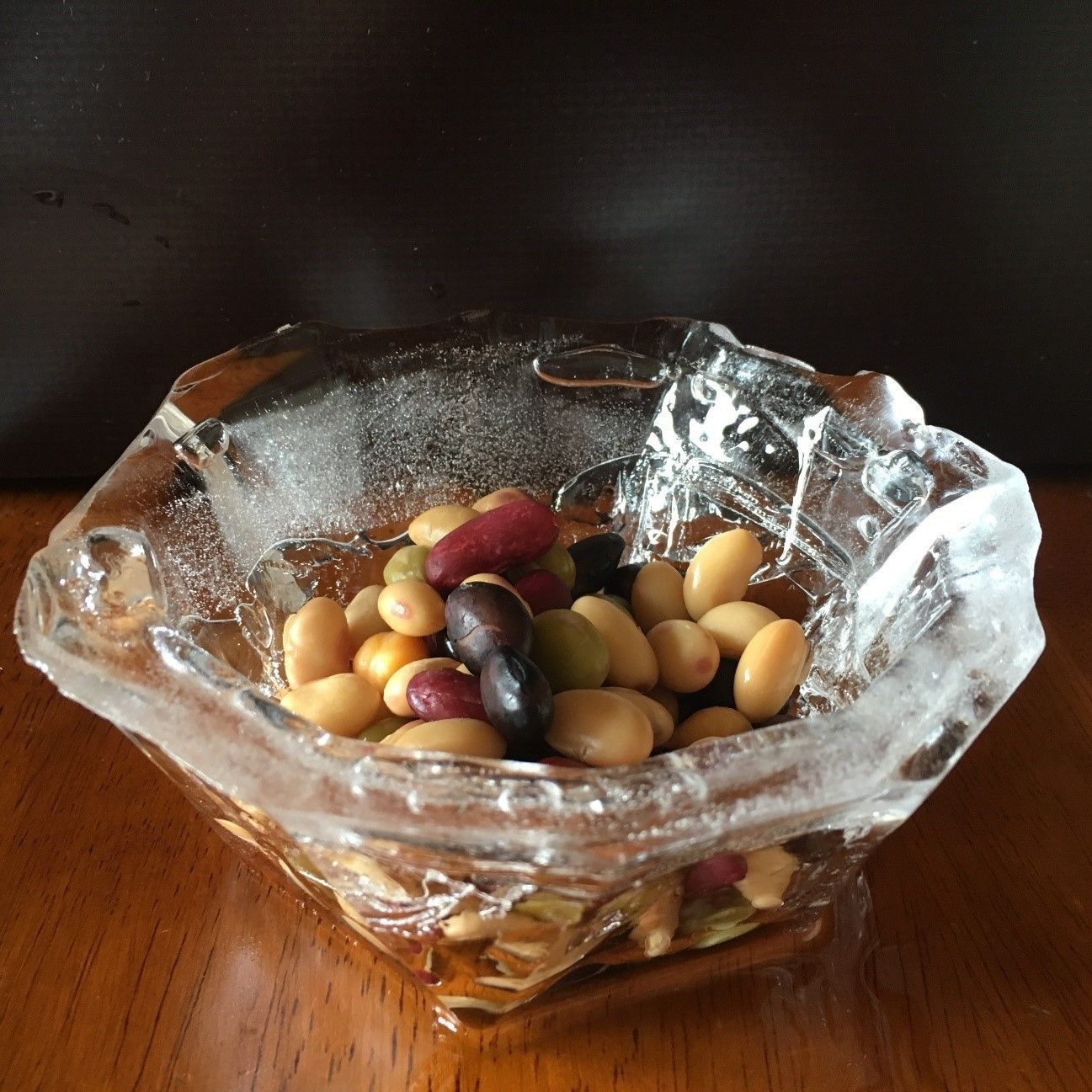思ったより器の中は小さいのですが、冷蔵庫にあったサラダ豆(85g)を入れるくらいなら十分。ちょっとしたおつまみや、デザートならちょうどいいサイズですね。ただし、会話に夢中になって時間が経つと溶けてしまいます。くれぐれも、うつわが溶ける前に食べ終わるようにしてくださいね。
