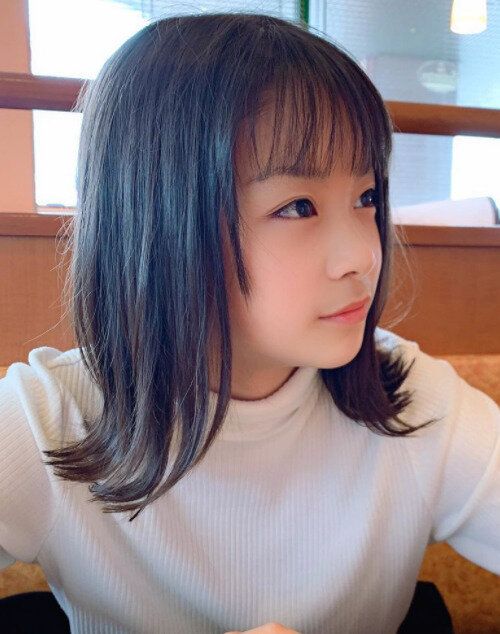 鎖骨ラインで直線的にカットされたミディアムヘア。レイヤーを入れていないので重めのシルエットですが、自分で1つにまとめやすいです。前髪は少しラウンド状にカットされており、厚めに残すのがポイントです。正統派のミディアムヘアなので、学校での印象もバッチリ!