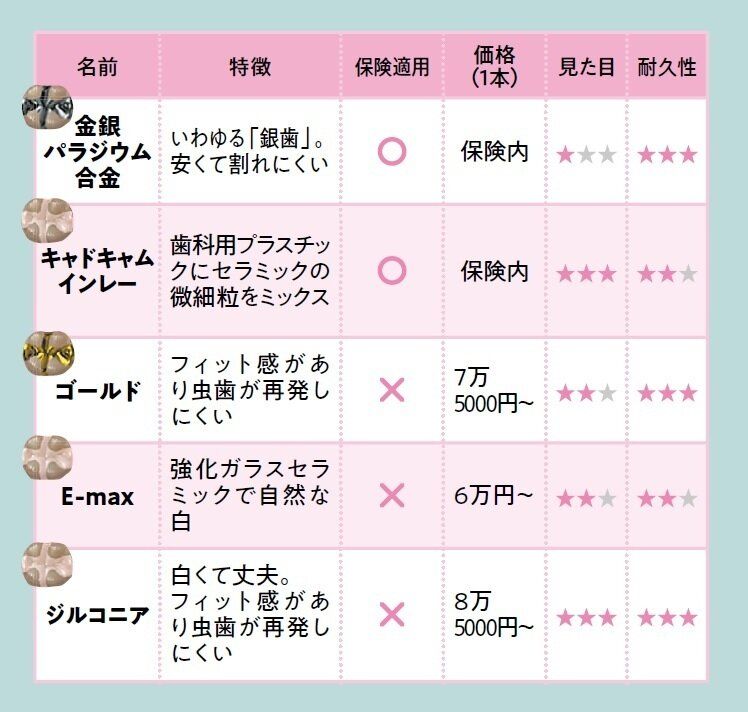 保険適用の銀歯は、接着剤の耐用年数が6~8年。接着剤の劣化部分には虫歯が再発しやすく、治療が必要に。長い目で見れば、値段は高くても長持ちするジルコニアやゴールドがおすすめ。