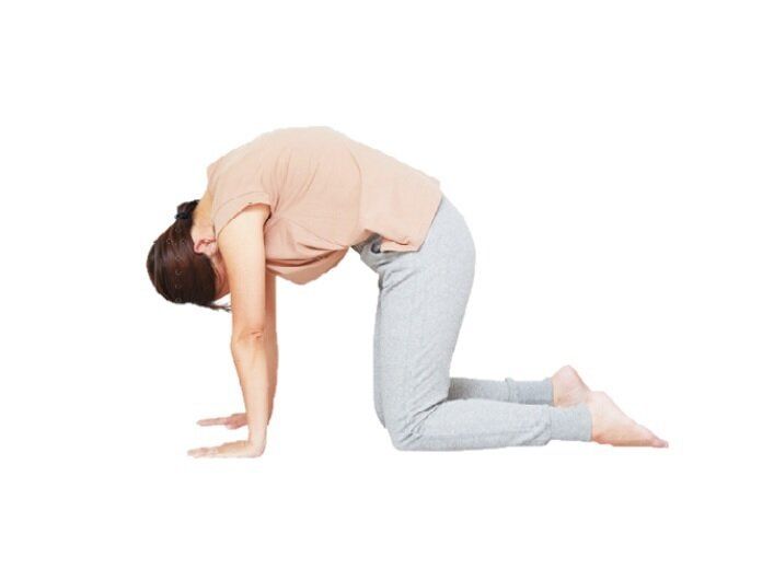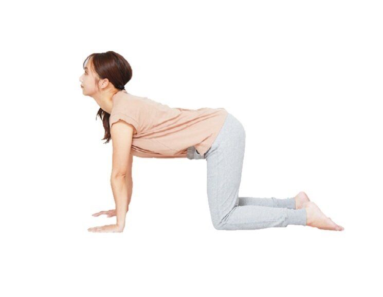 (1)四つんばいになり、息を吐きながらゆっくりと背中を丸める。