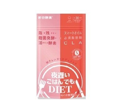 独自開発の「活きている酵素」と、ベニバナから作られた「スマートオイルCLA」を配合したサプリ。食事の乱れが気になる人に。「夜遅いごはんでも Wクレンズボディメイク」(約30回分)¥2,678(税込み)/新谷酵素TEL0120・51・4848