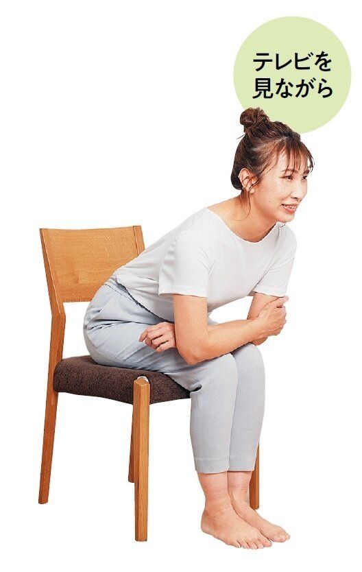 いすに座ったまま上体をやや倒して、ももの上にひじをつき、お尻を少し突き出した状態で、骨盤底筋を意識して動かす。