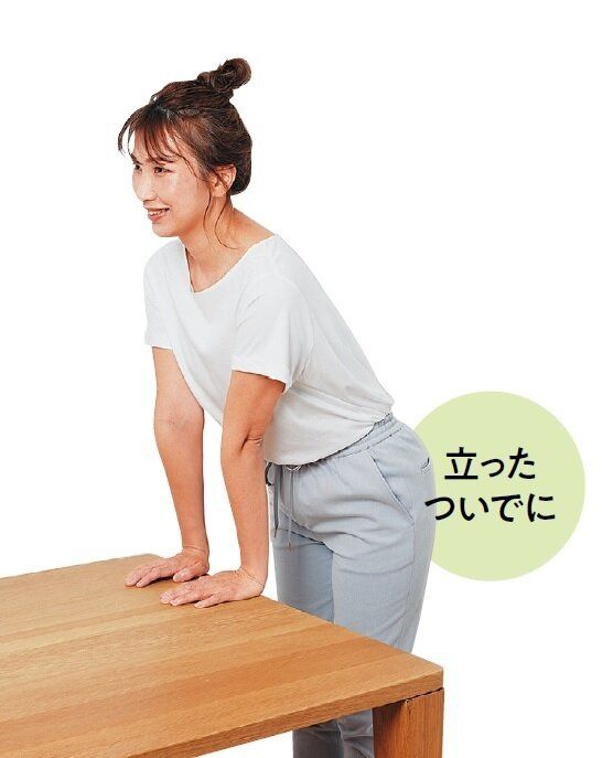 立っているとき、テーブルや机に両手をついて背筋を伸ばす。お尻に力が入りすぎず、骨盤底筋が動かしやすい。
