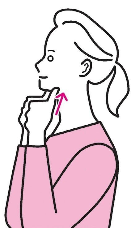 (1)両手の親指をそろえて、顎の下から口の中の舌を押し上げるようにやや強めに押す。