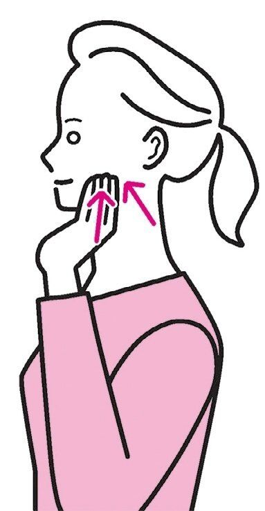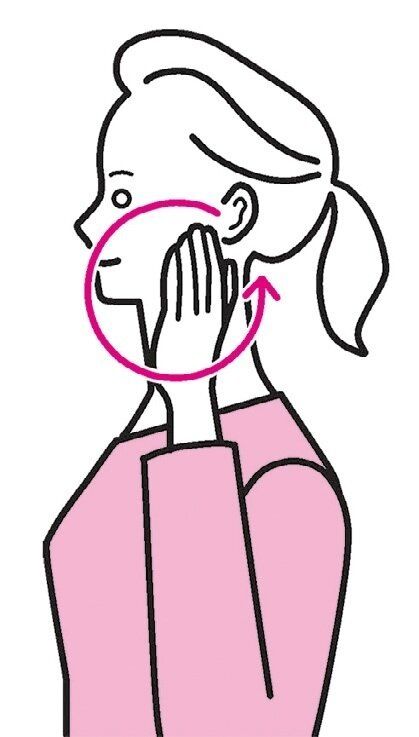 (3)両手の4本の指を頬に当て、奥歯のあたりから前へ円を描くようにマッサージする。