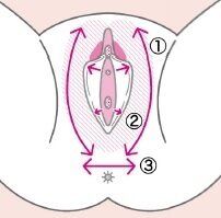 オイルをデリケートゾーン全体になじませ、(1)大陰唇、(2)小陰唇、(3)会陰の順番で、指の腹で矢印のようにマッサージ。最後に膣の中に指を入れて、内側をなぞります。